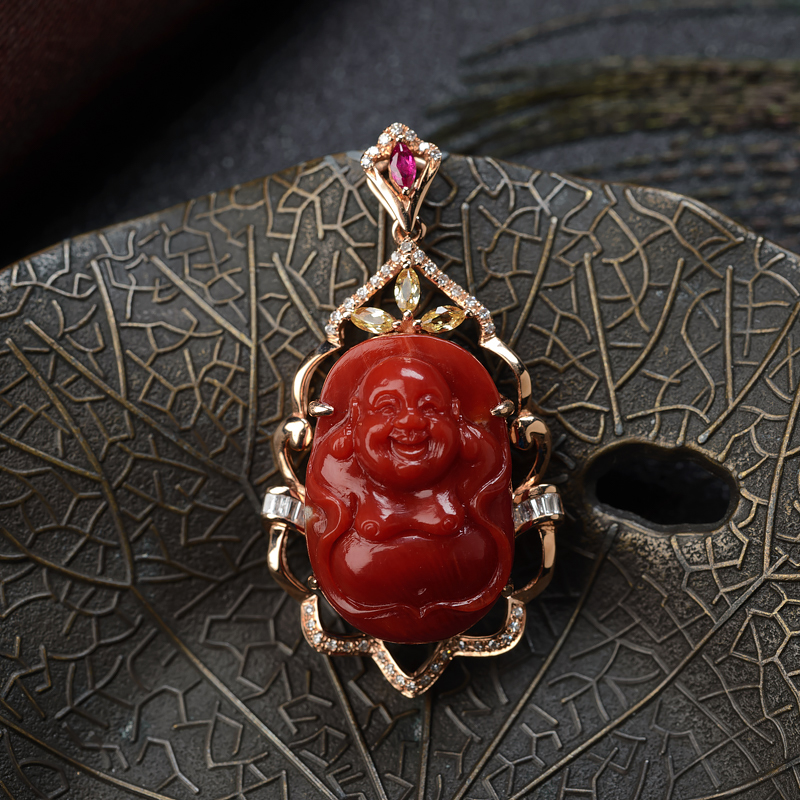 • 18K阿卡牛血红珊瑚弥勒佛吊坠