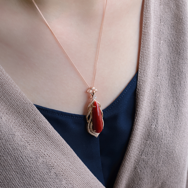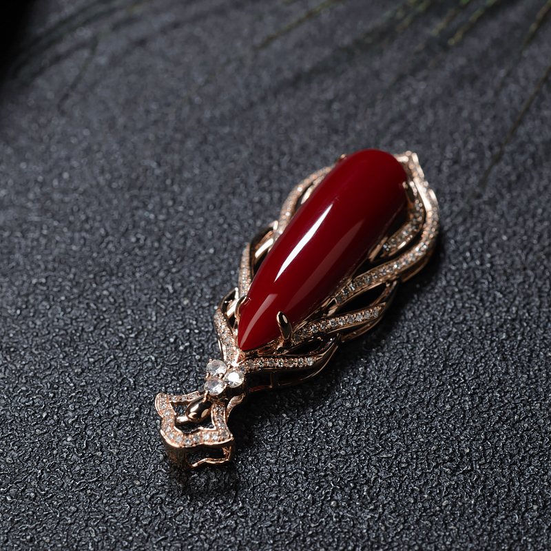 • 18K阿卡牛血红珊瑚水滴吊坠