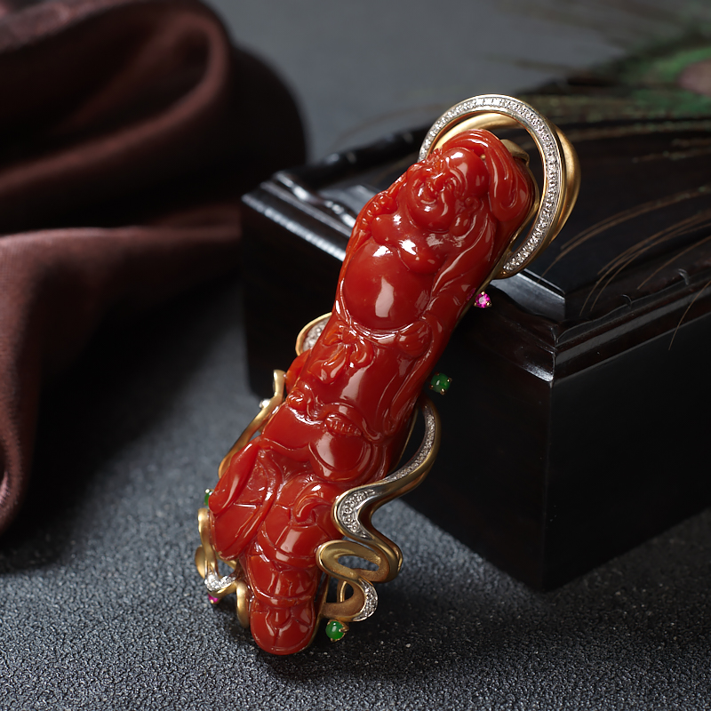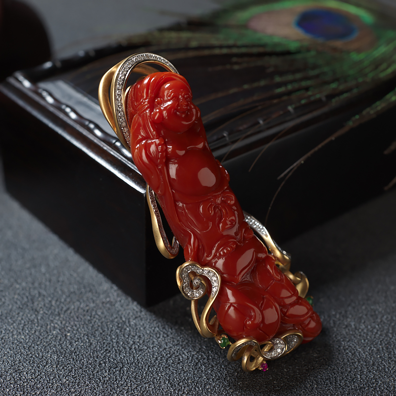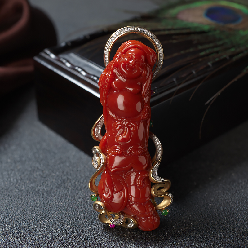 • 18K阿卡牛血红珊瑚弥勒佛吊坠