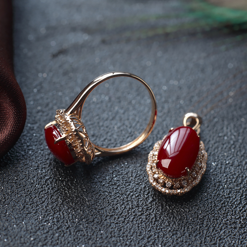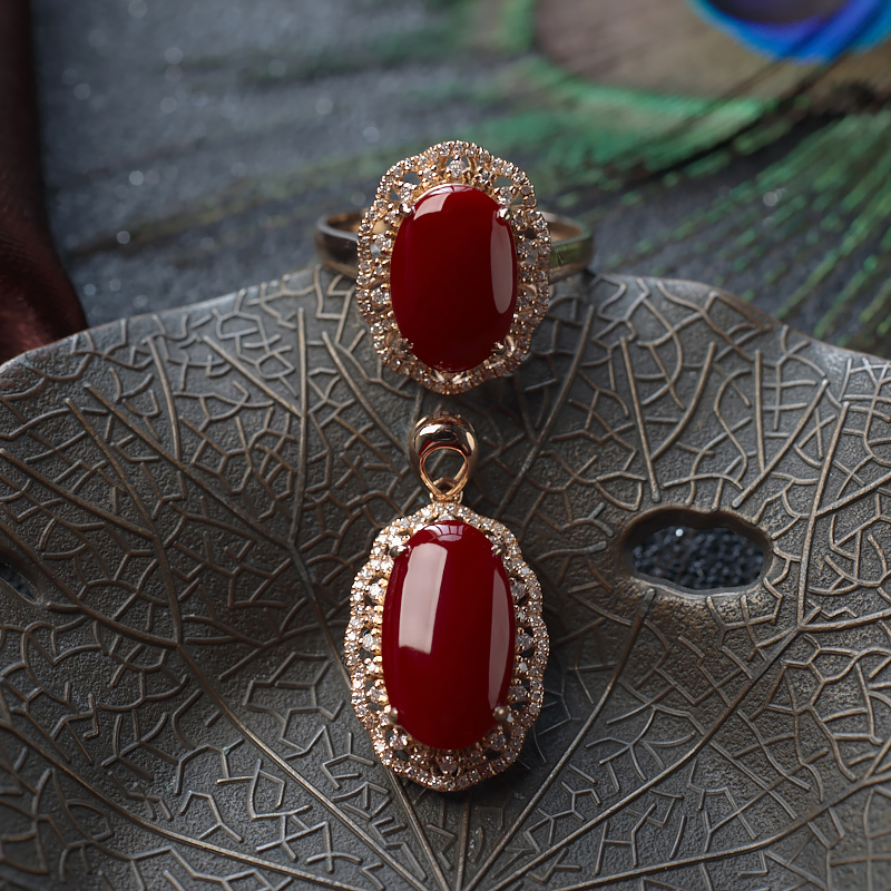 • 18K阿卡牛血红珊瑚戒指/吊坠套装