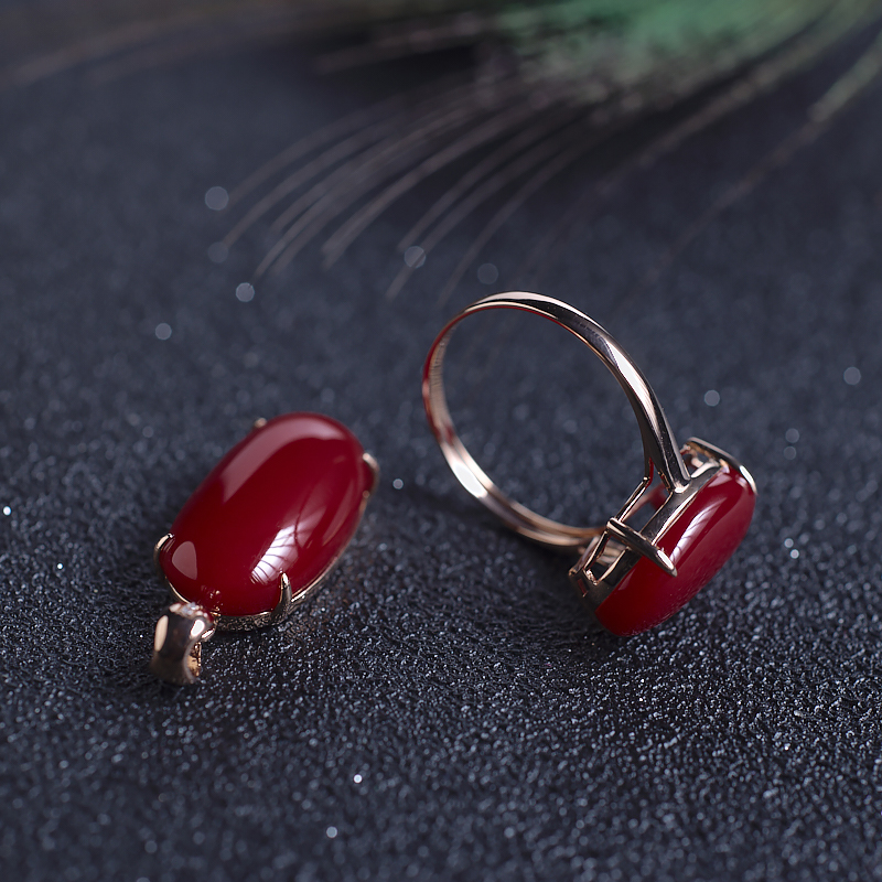 • 18K阿卡牛血红珊瑚戒指/吊坠套装