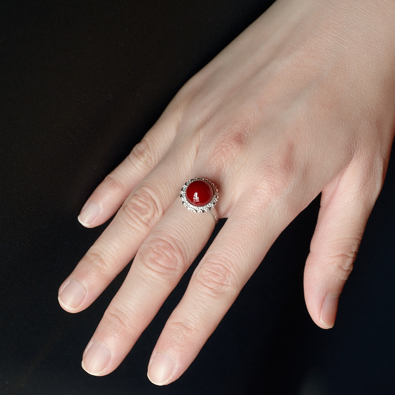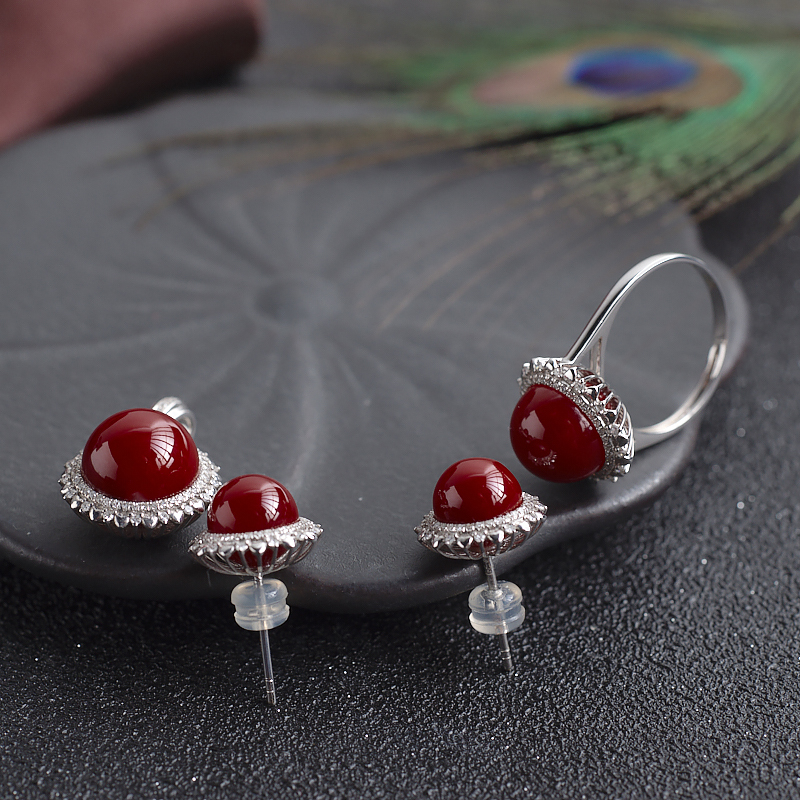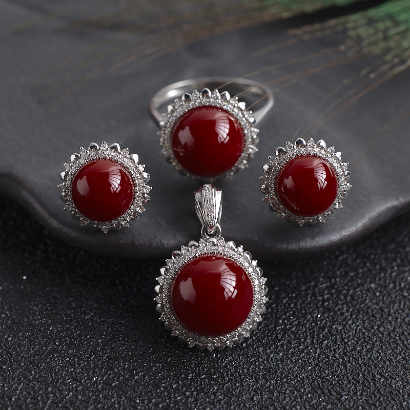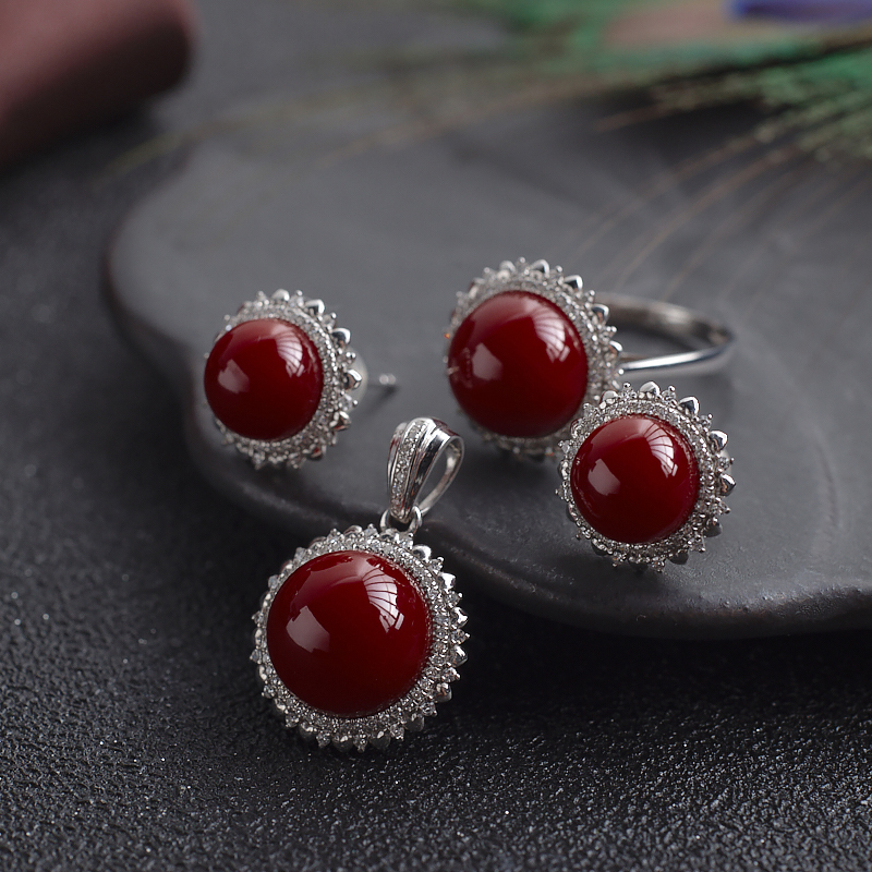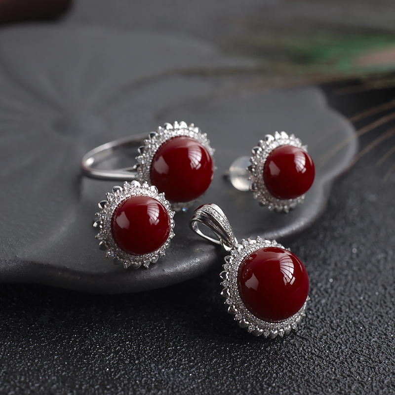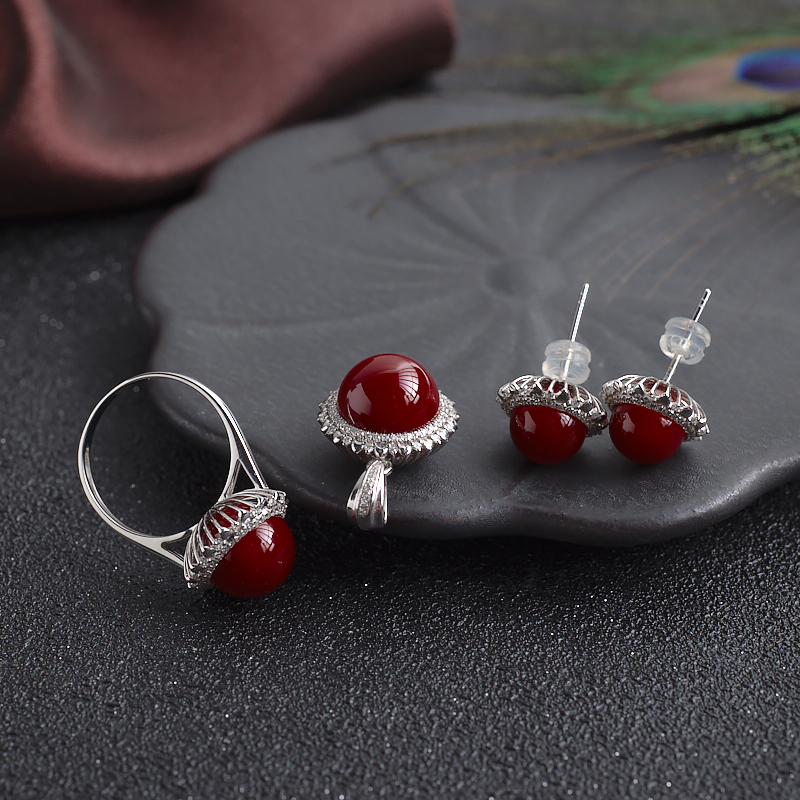 • [名  称] 18K阿卡牛血红珊瑚圆珠戒指/吊坠/耳钉套装