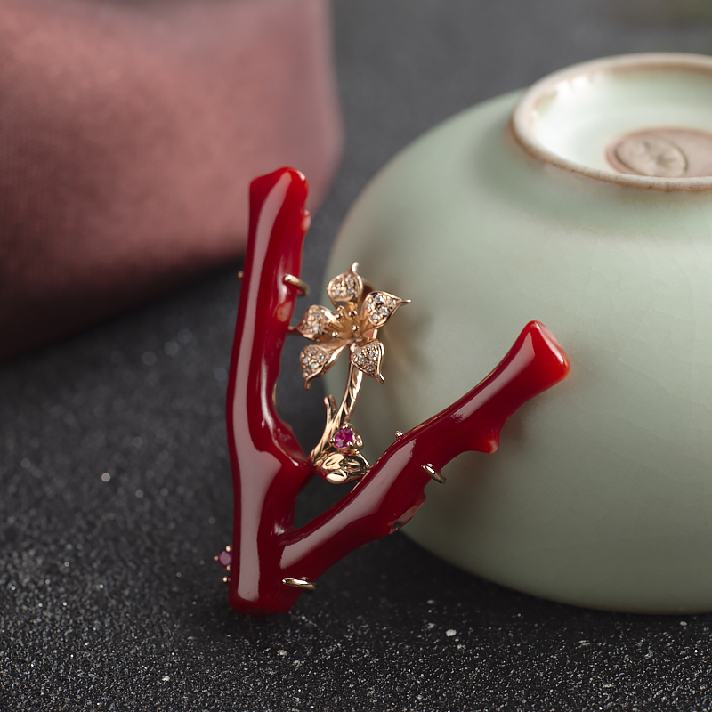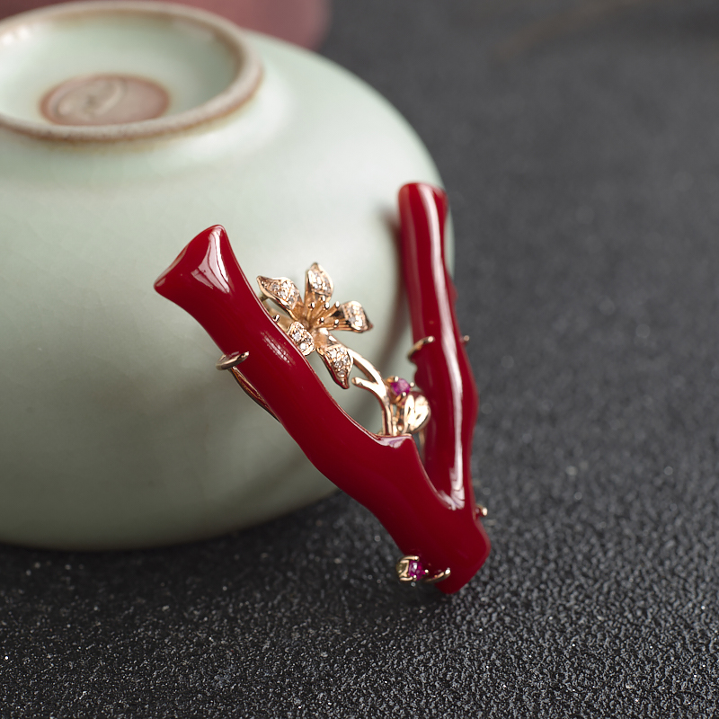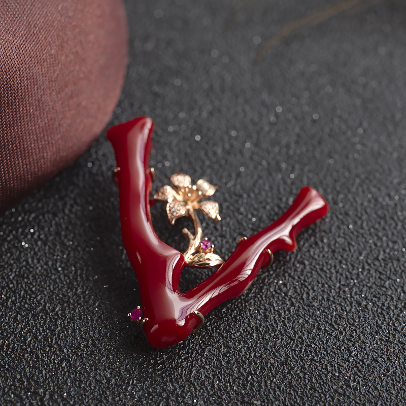 • 18K阿卡牛血红珊瑚树枝吊坠