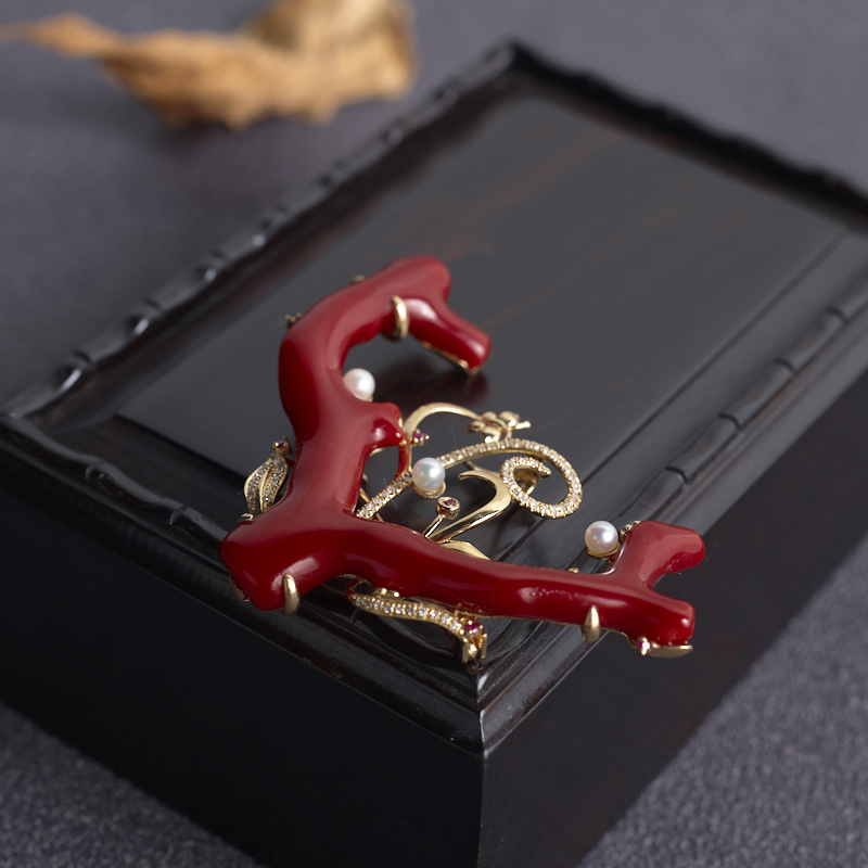 • 18K阿卡牛血红珊瑚树枝吊坠/胸针两用款