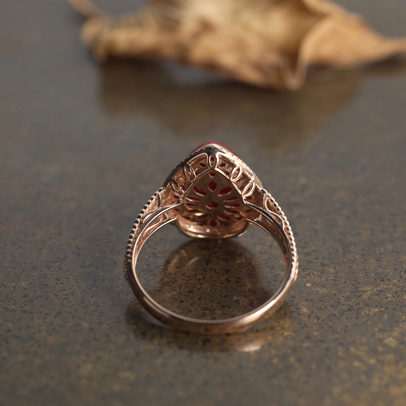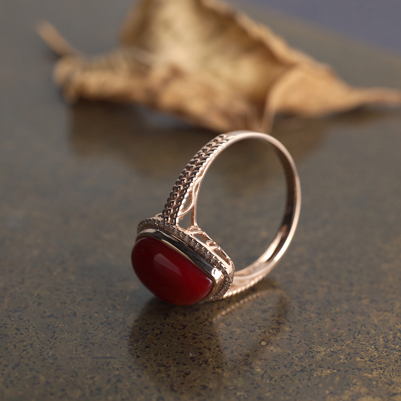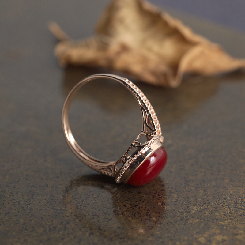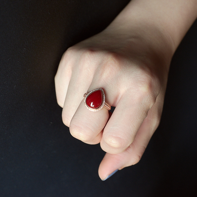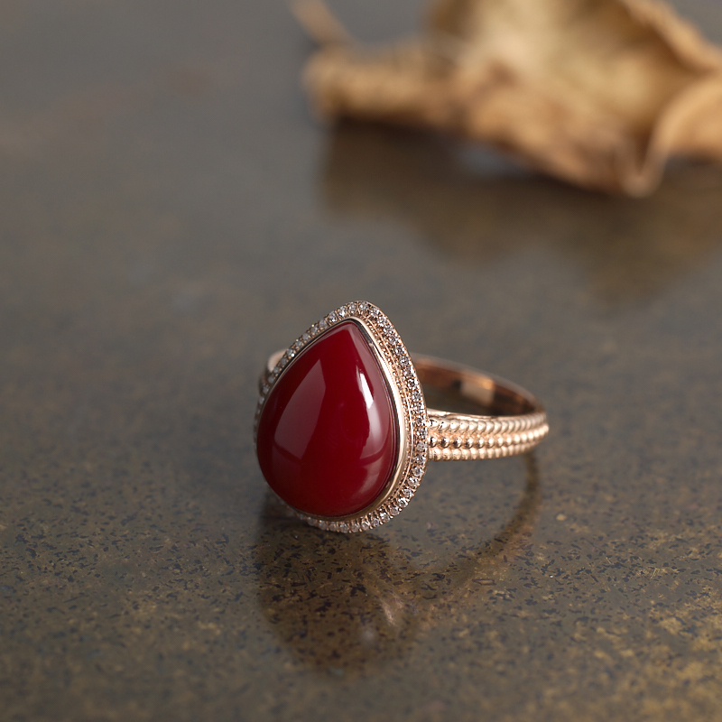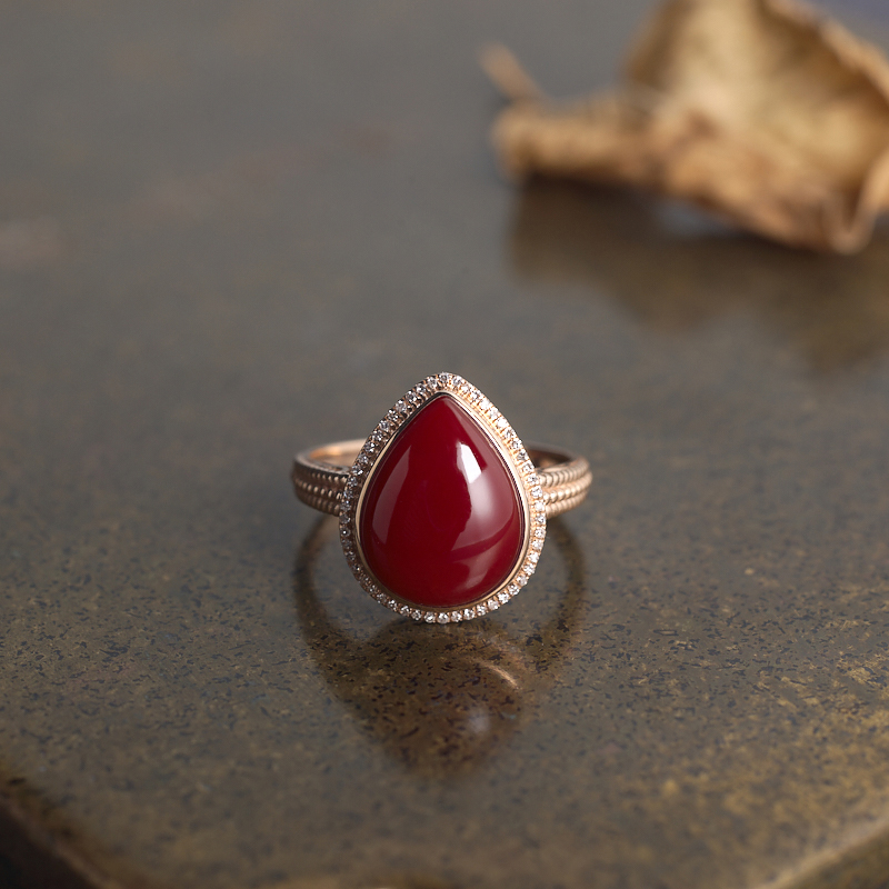 • 18K阿卡牛血红珊瑚水滴戒指