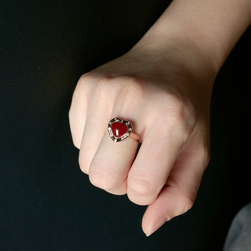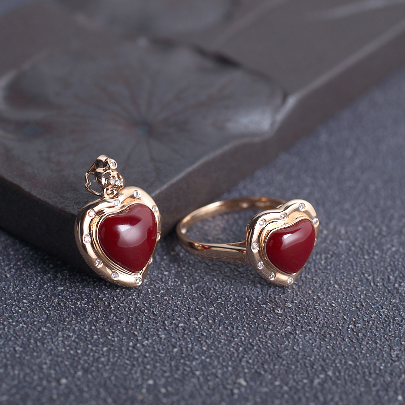 • 18K阿卡牛血红珊瑚心形戒指/吊坠套装