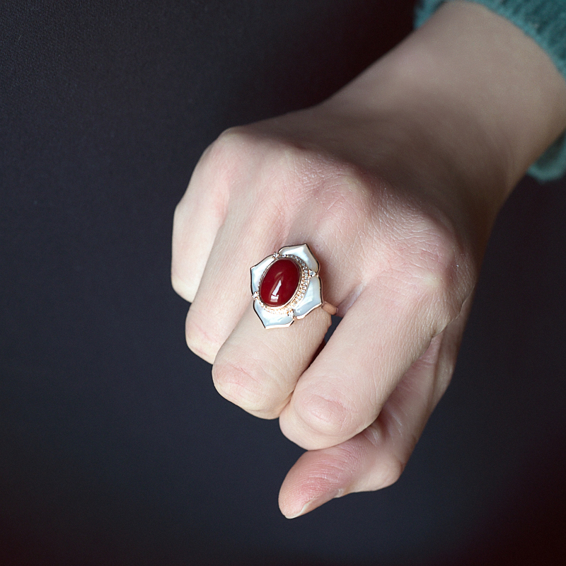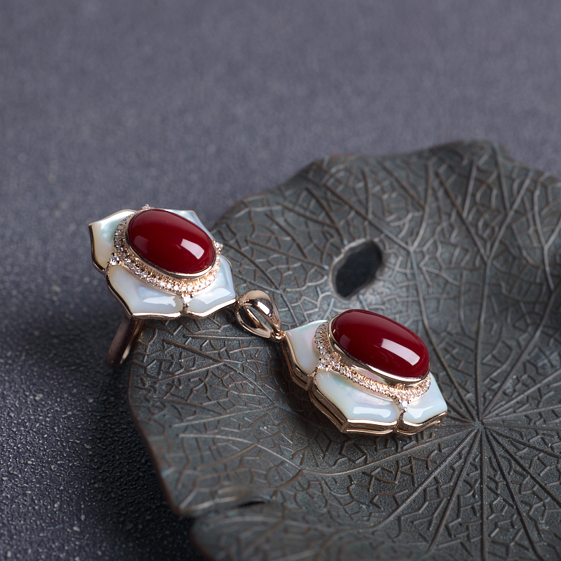• 18K阿卡牛血红珊瑚戒指/吊坠套装