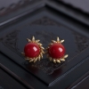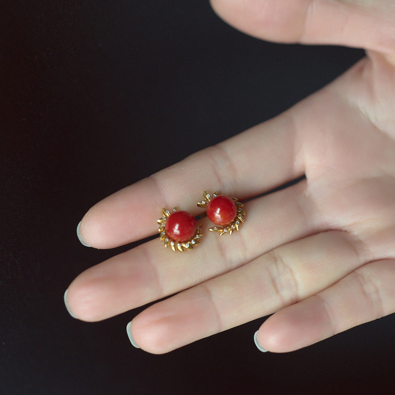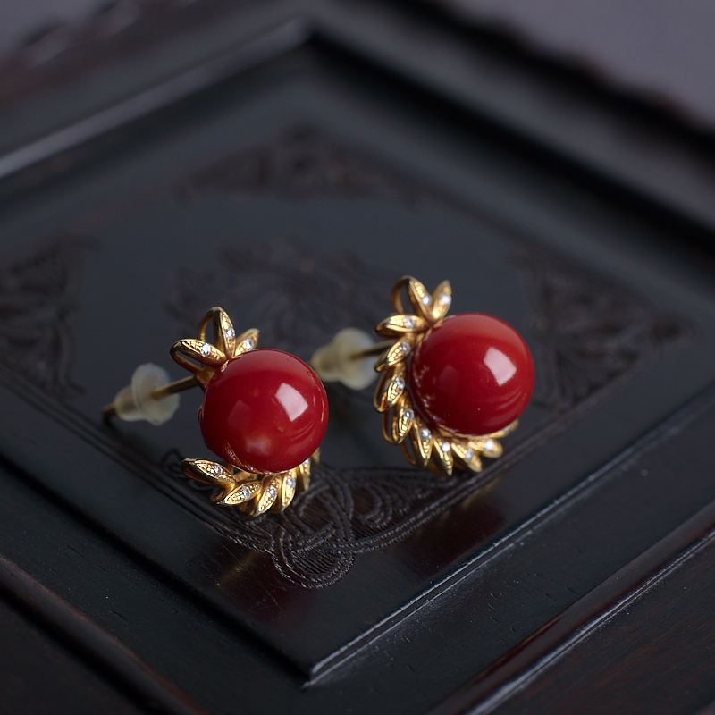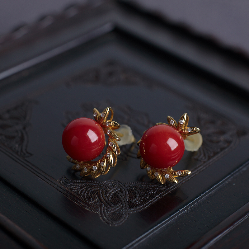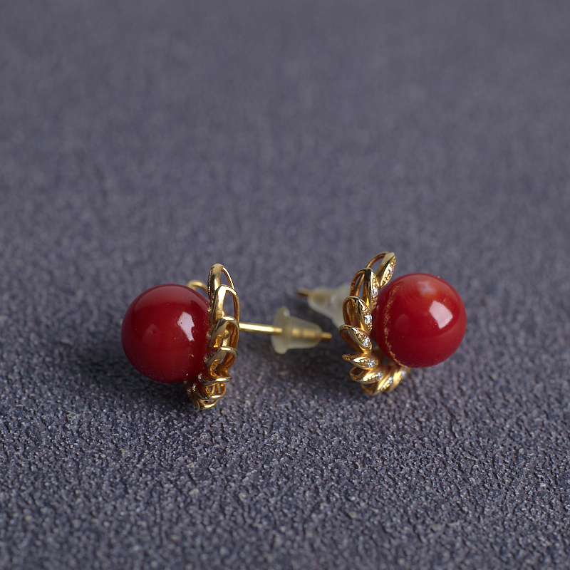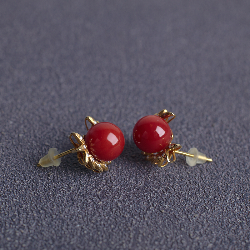 • 18K阿卡牛血红珊瑚圆珠耳钉