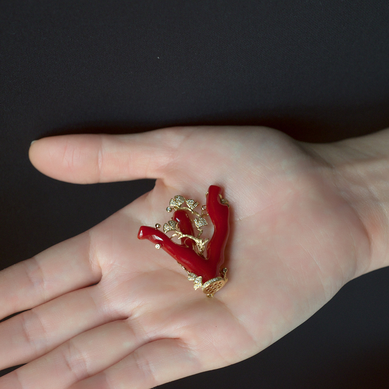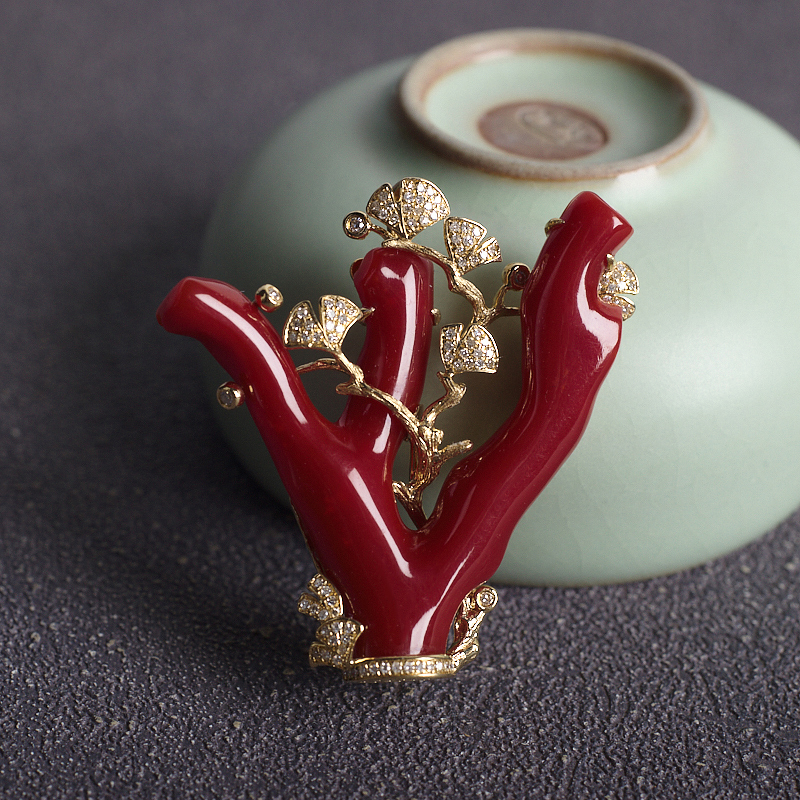 • 18K阿卡牛血红珊瑚树枝吊坠/胸针两用款