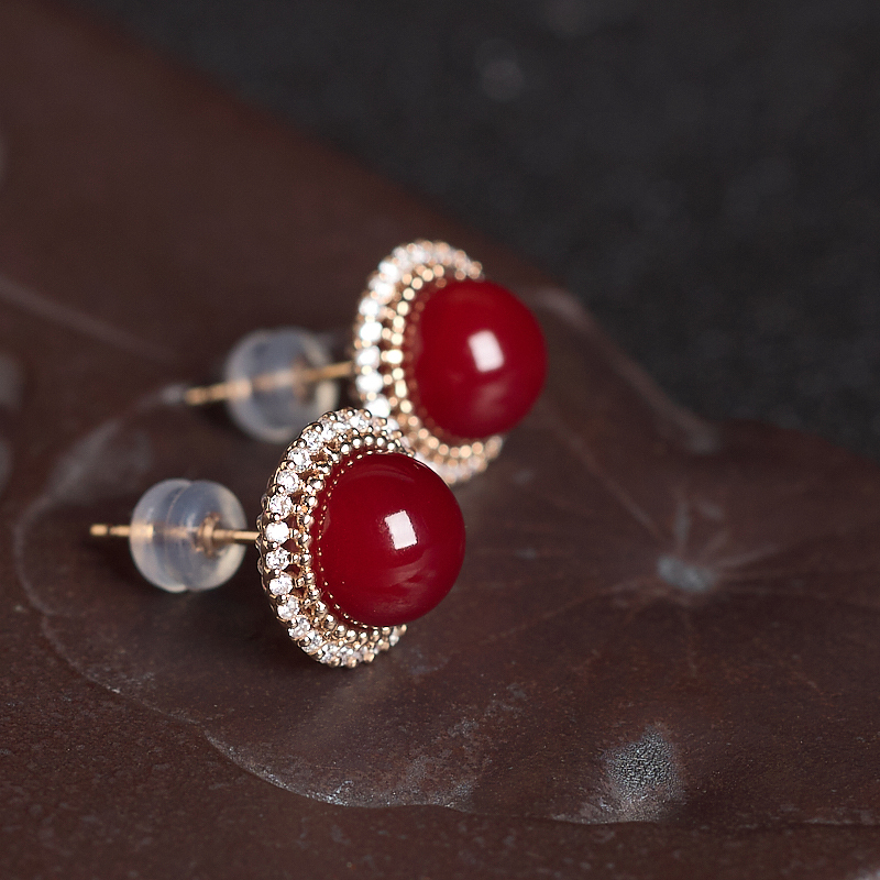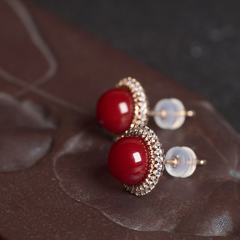 • 18K阿卡牛血红珊瑚圆珠耳钉