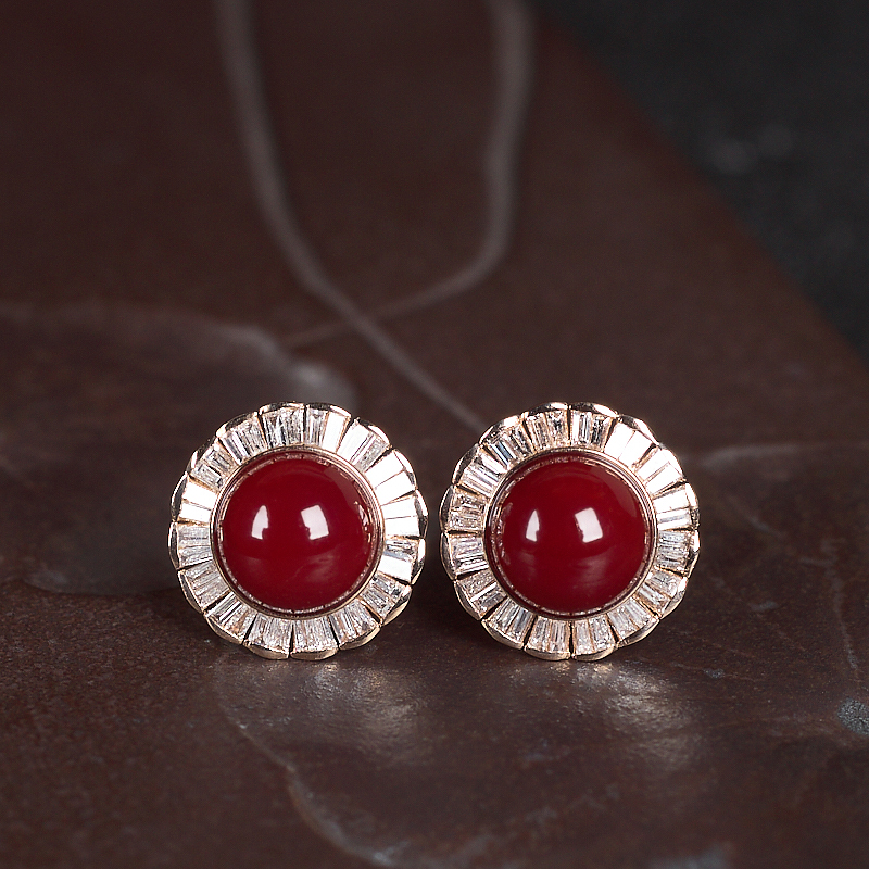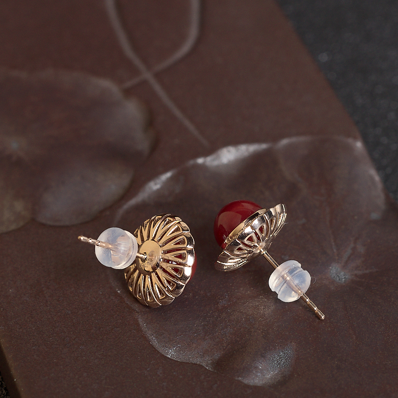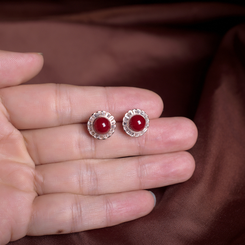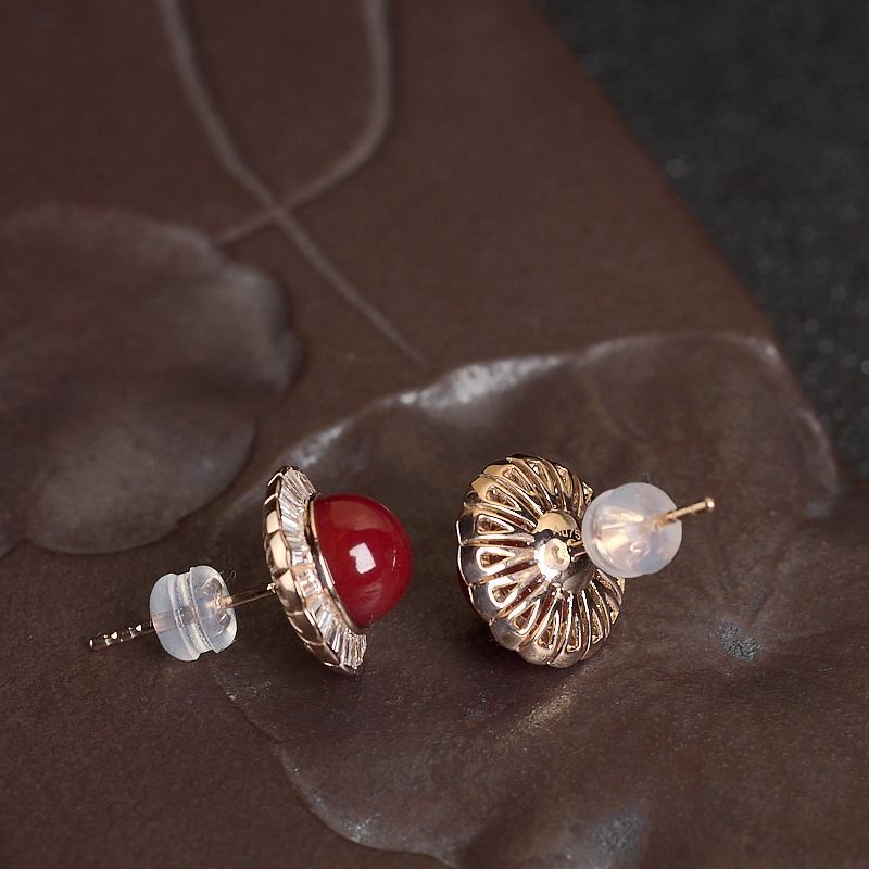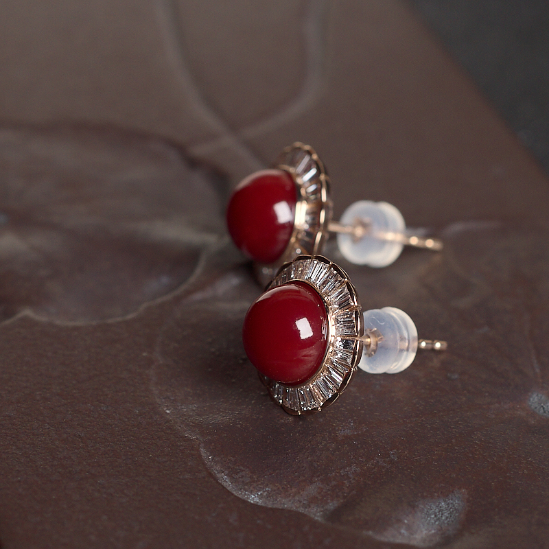 • 18K阿卡牛血红珊瑚圆珠耳钉