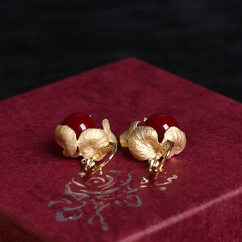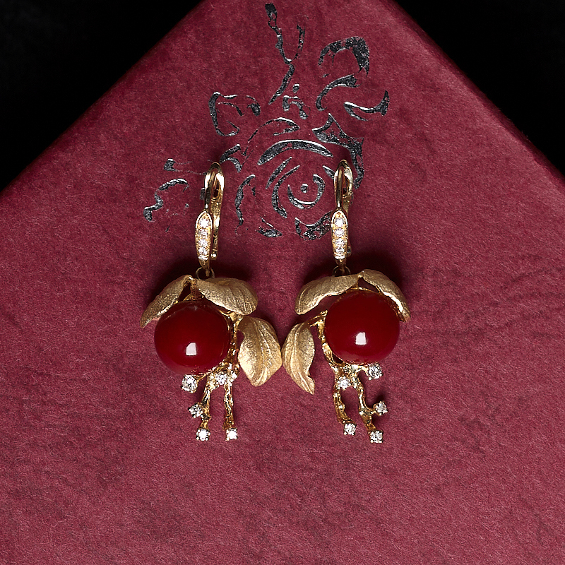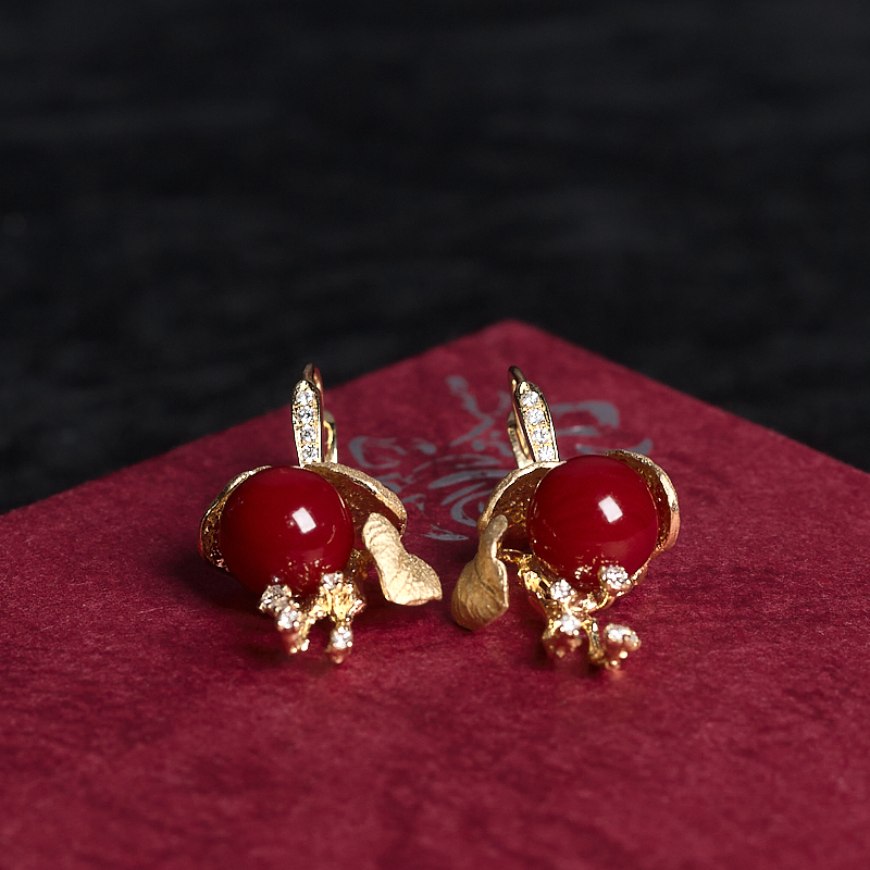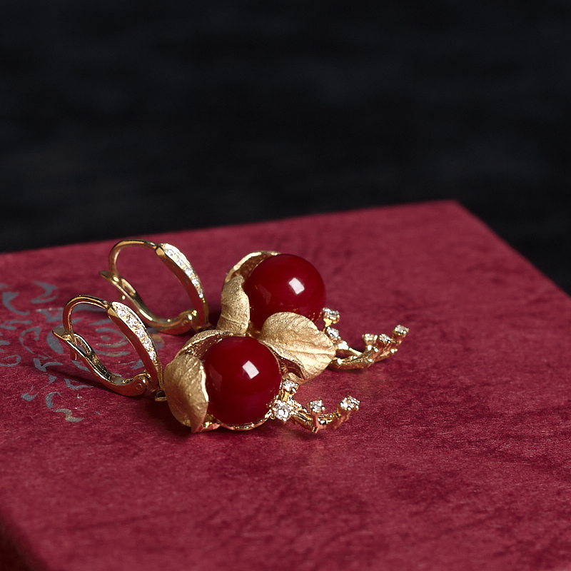 • 18K阿卡牛血红珊瑚圆珠耳坠