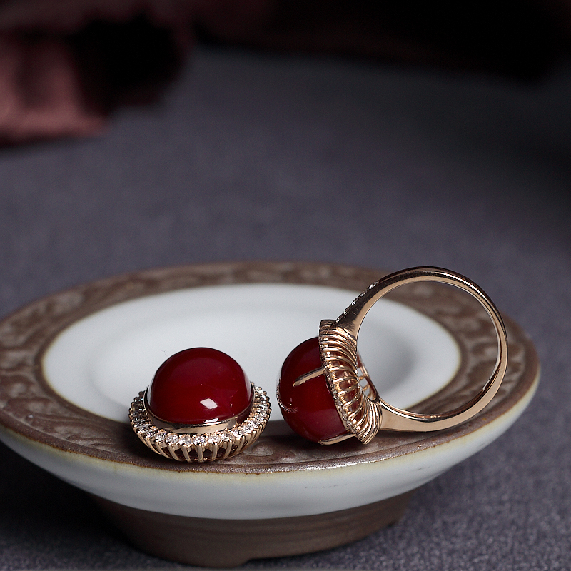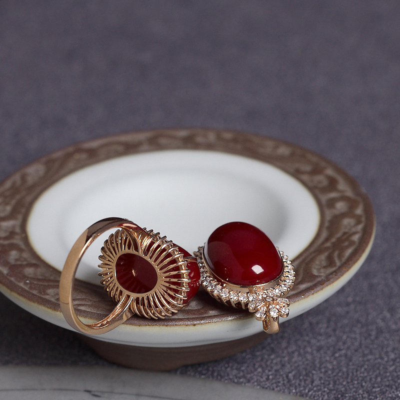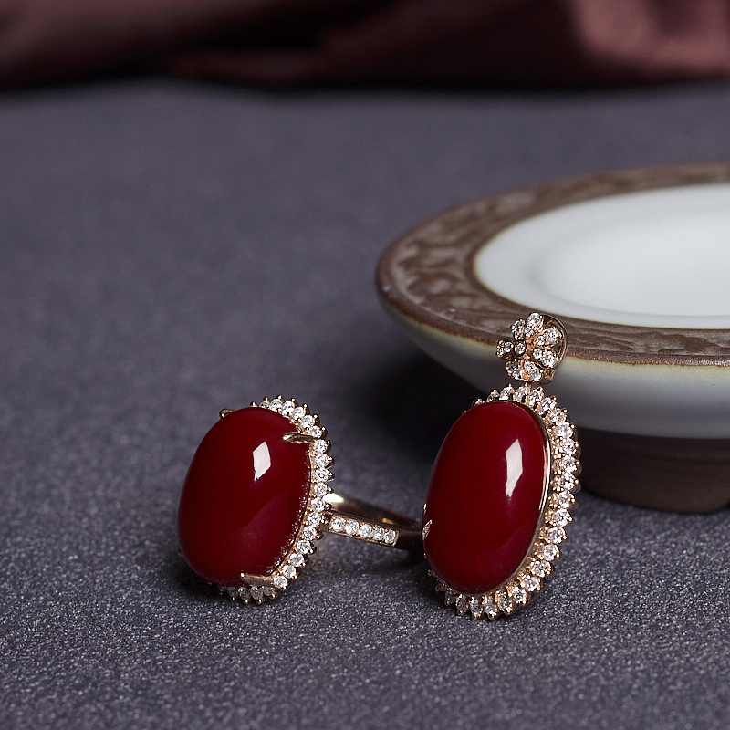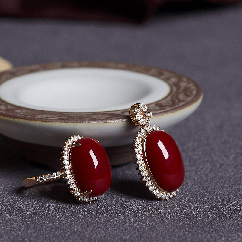 • 18K阿卡牛血红珊瑚戒指/吊坠套装