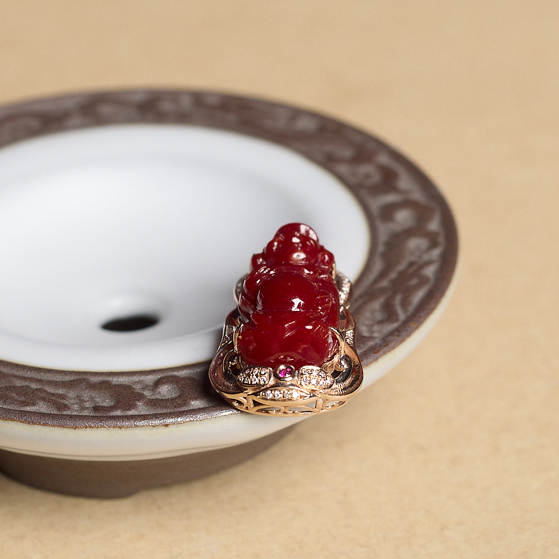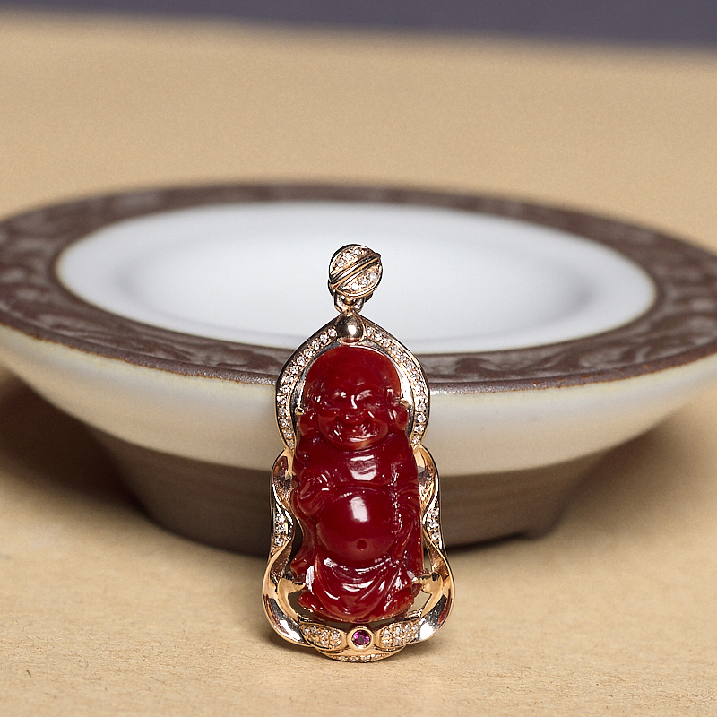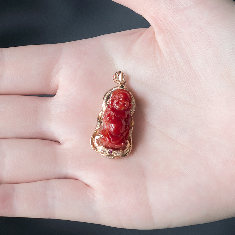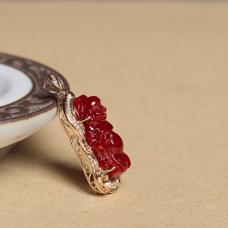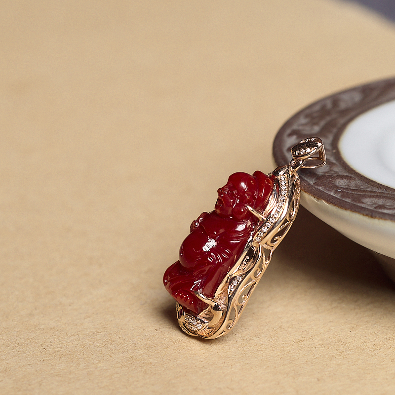 • 18K阿卡牛血红珊瑚弥勒佛吊坠