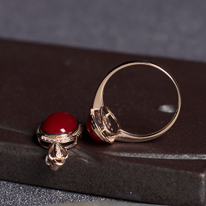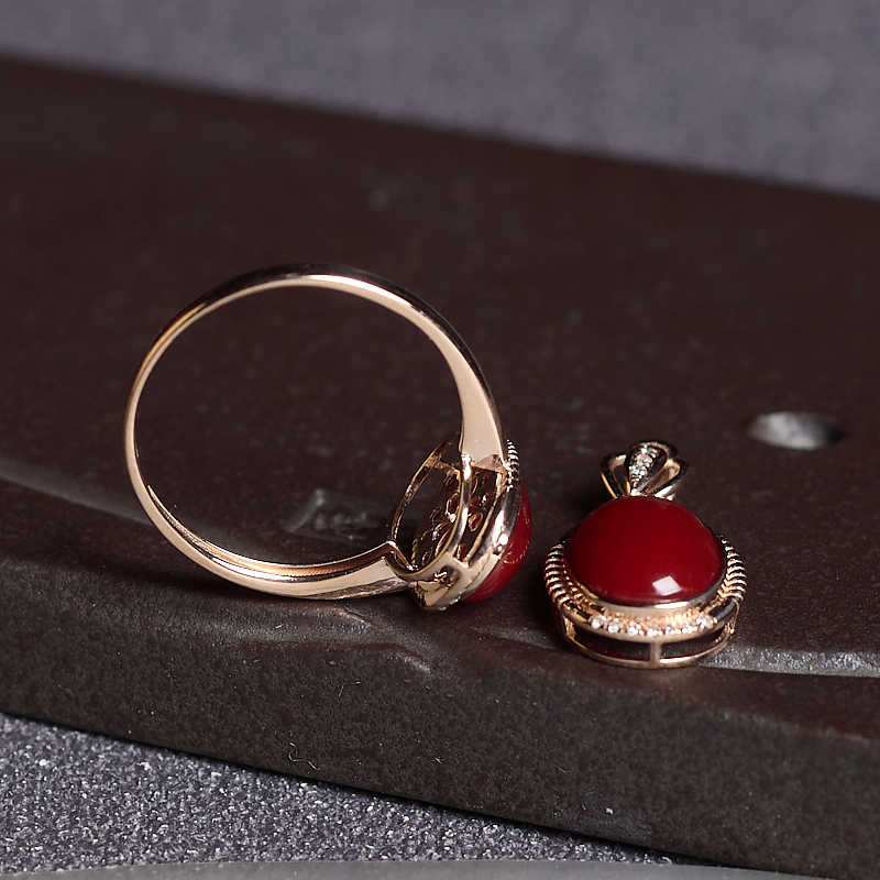 • 18K阿卡牛血红珊瑚戒指/吊坠套装