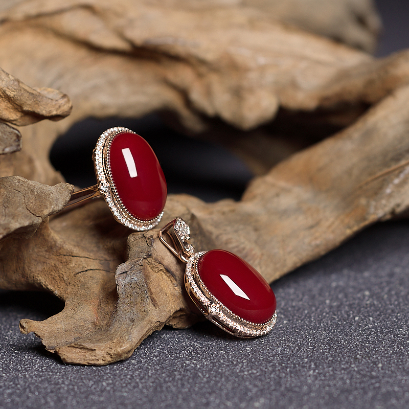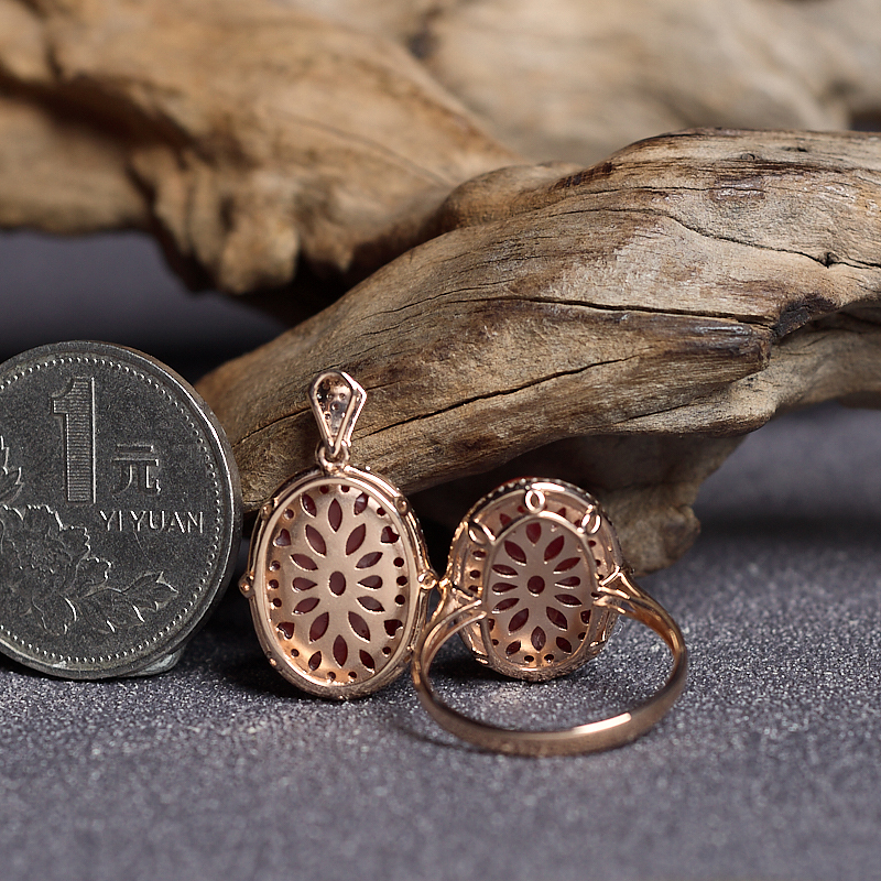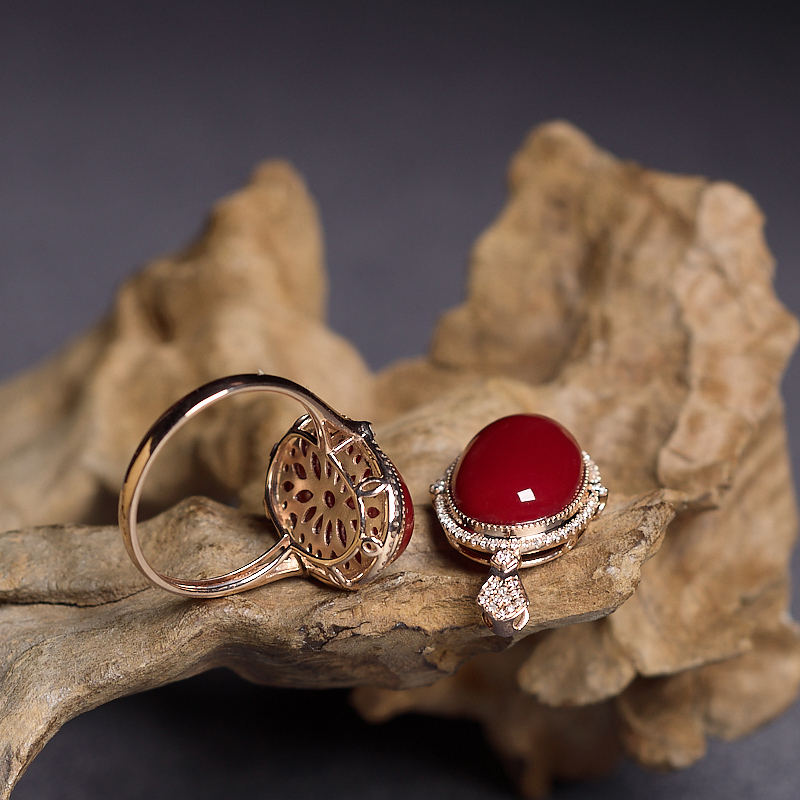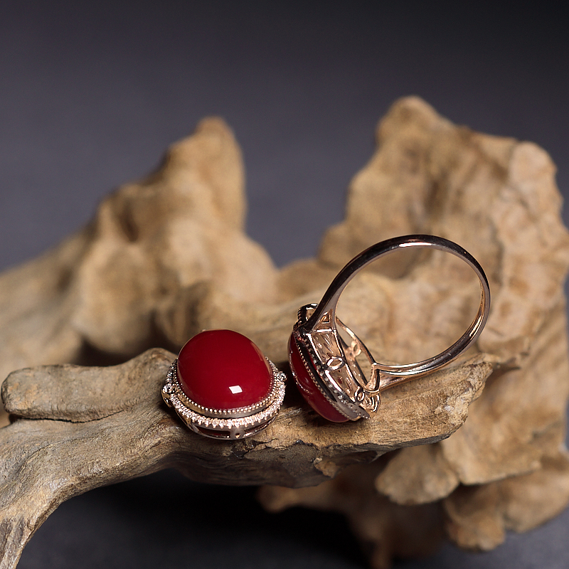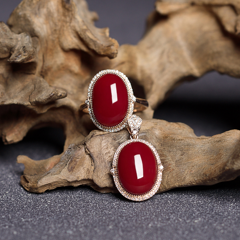 • 18K阿卡牛血红珊瑚戒指/吊坠套装