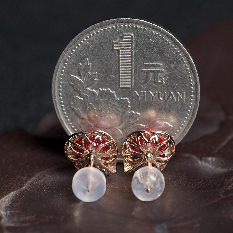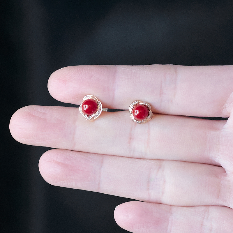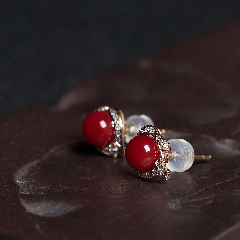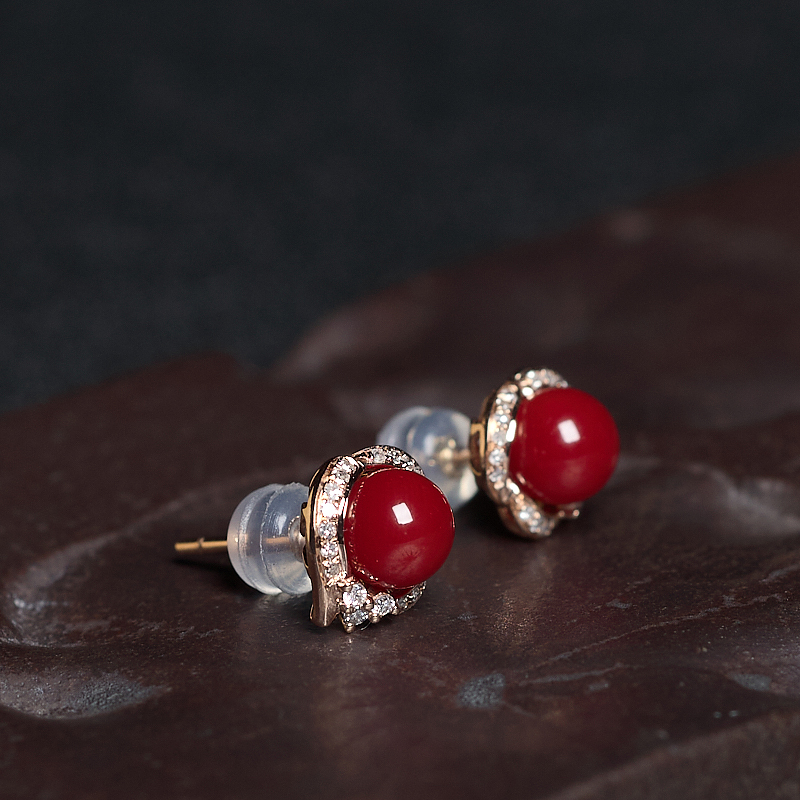 • 18K阿卡牛血红珊瑚圆珠耳钉