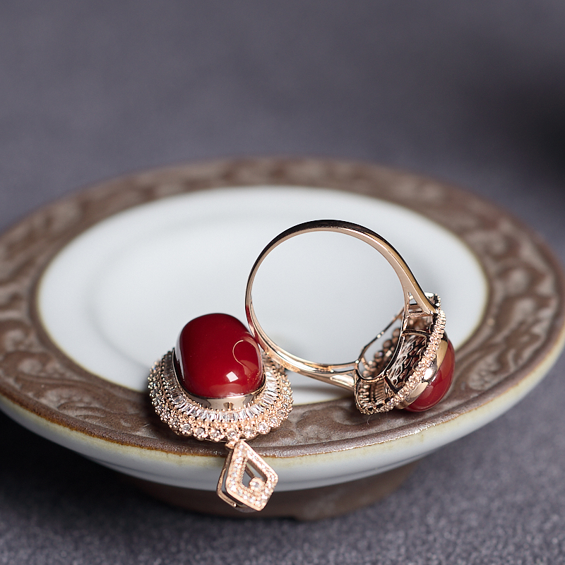 • 18K阿卡牛血红珊瑚戒指/吊坠套装