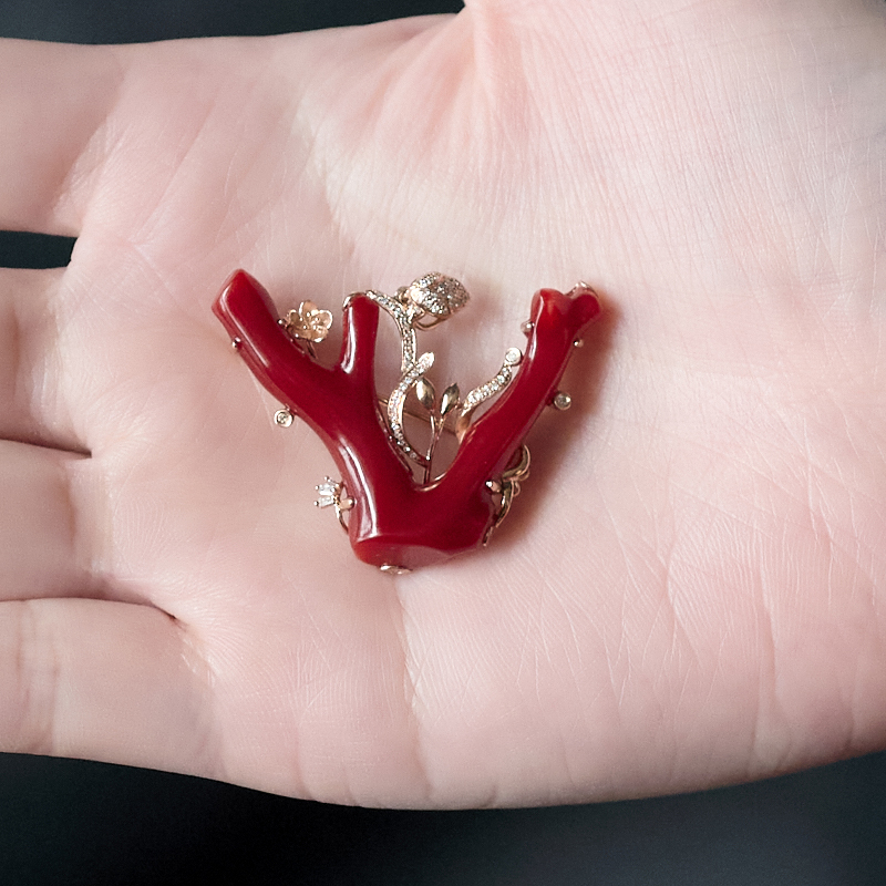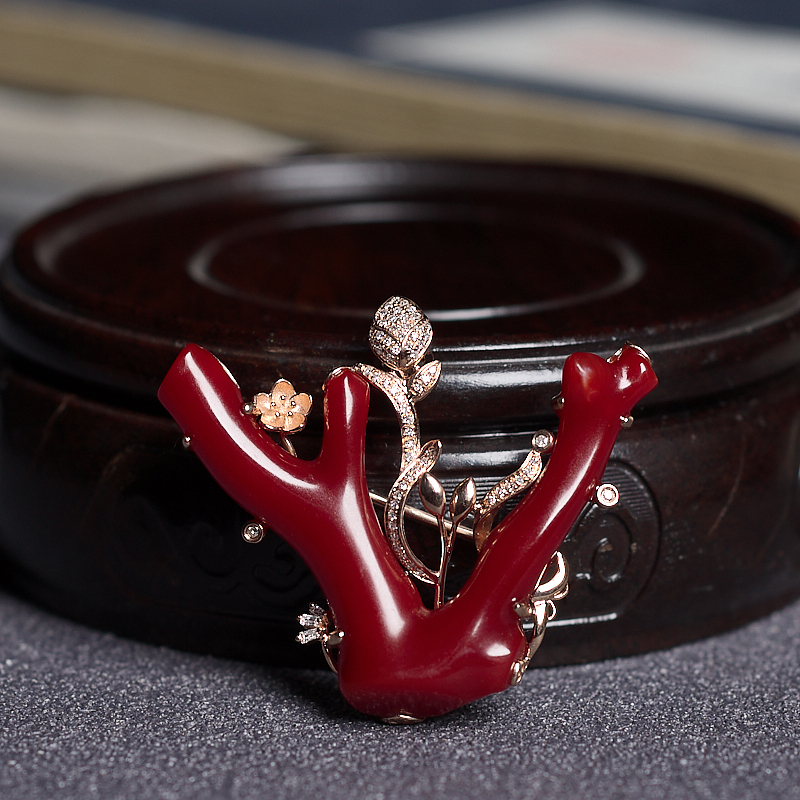 • 18K阿卡牛血红珊瑚树枝吊坠/胸针两用款