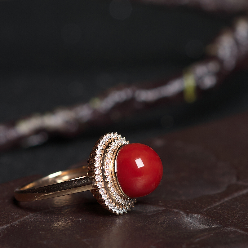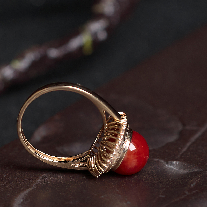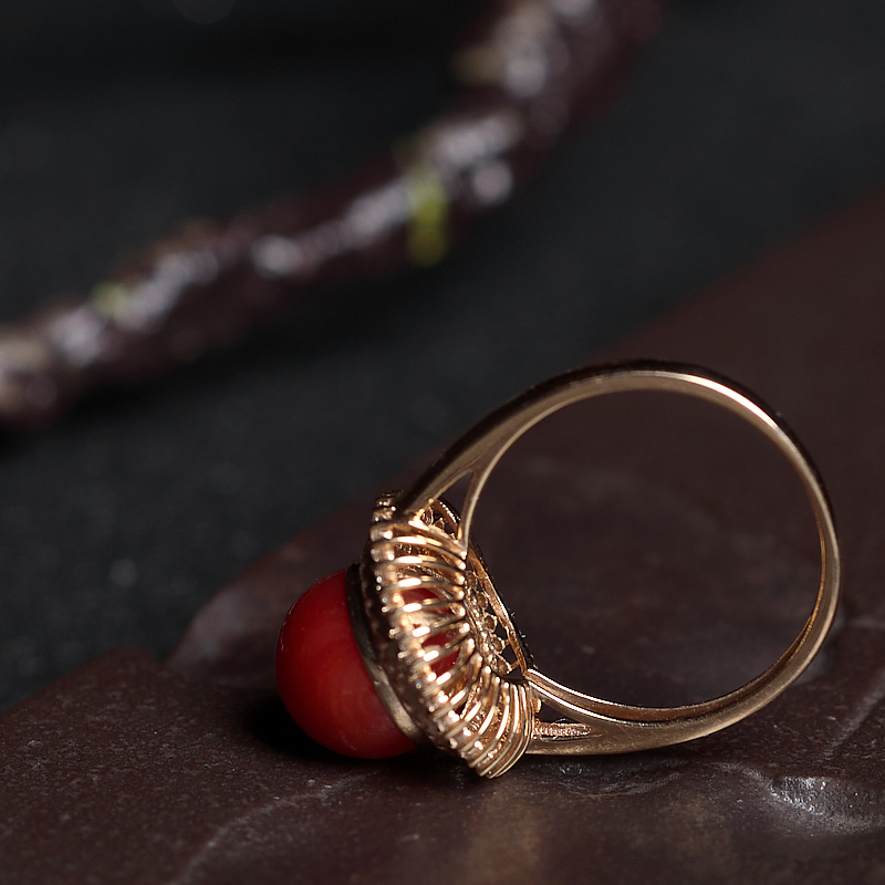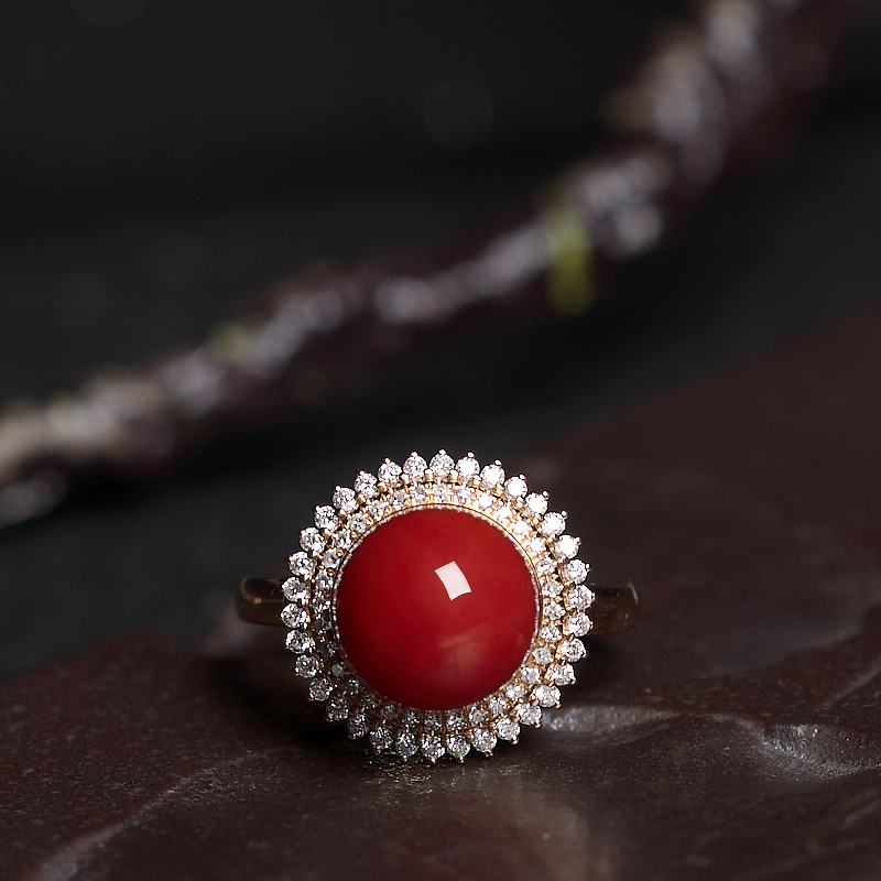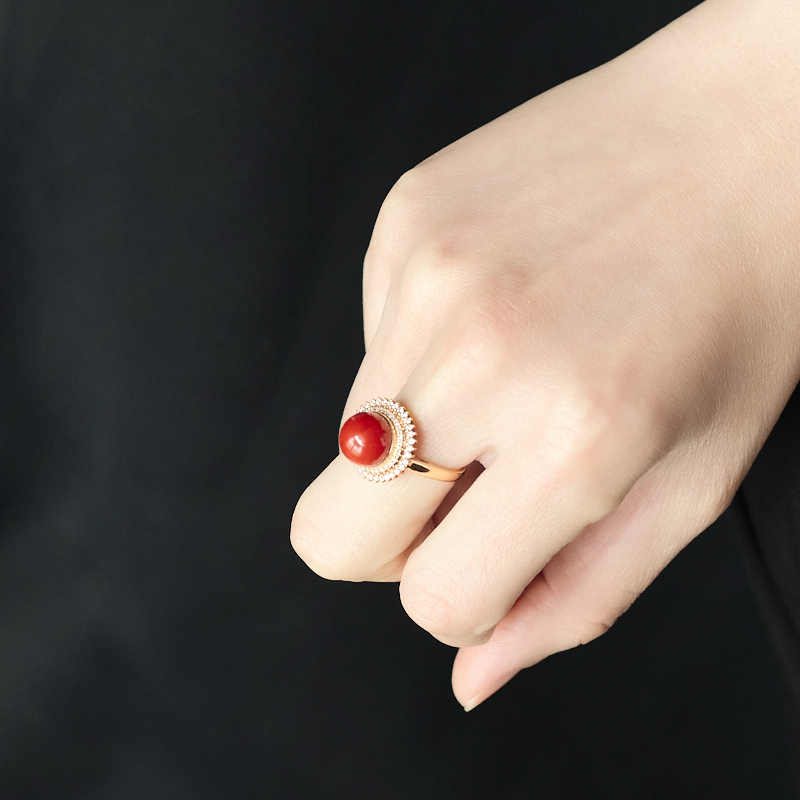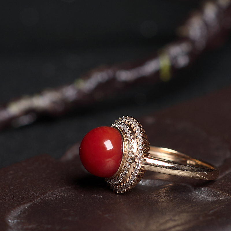 • 18K阿卡牛血红珊瑚圆珠戒指