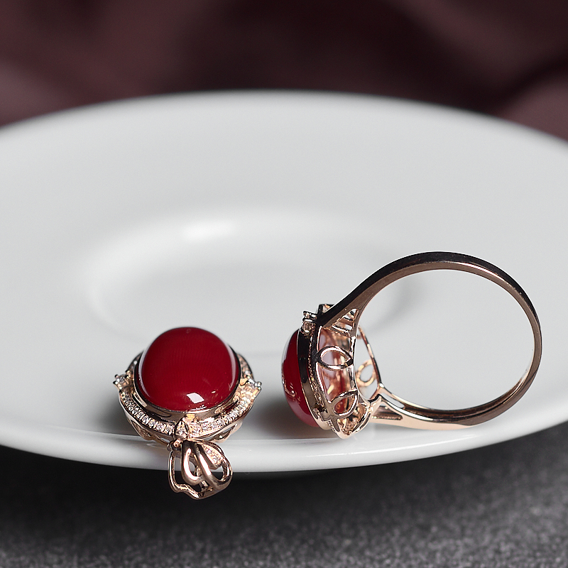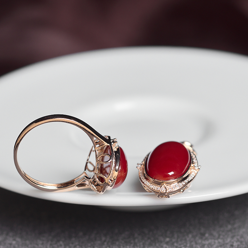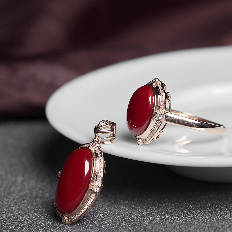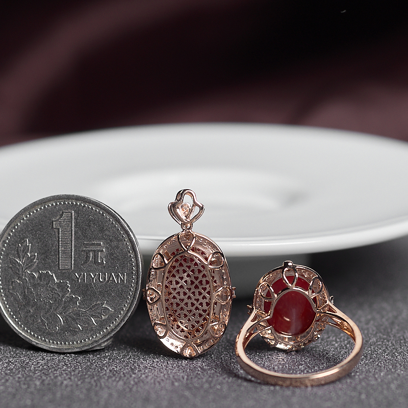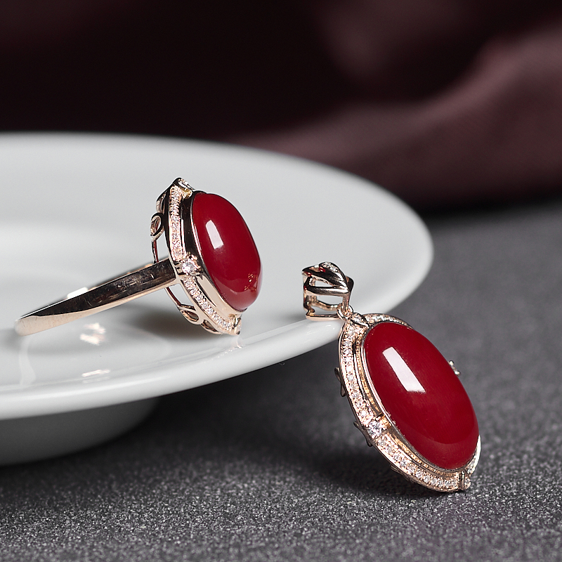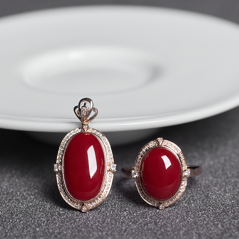 • 18K阿卡牛血红珊瑚戒指/吊坠套装
