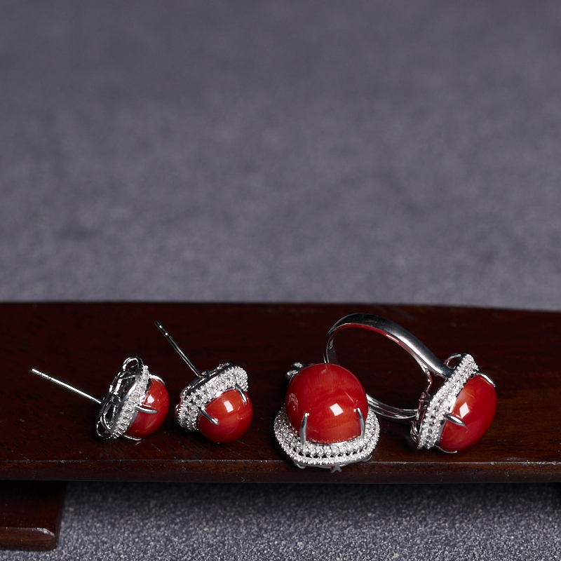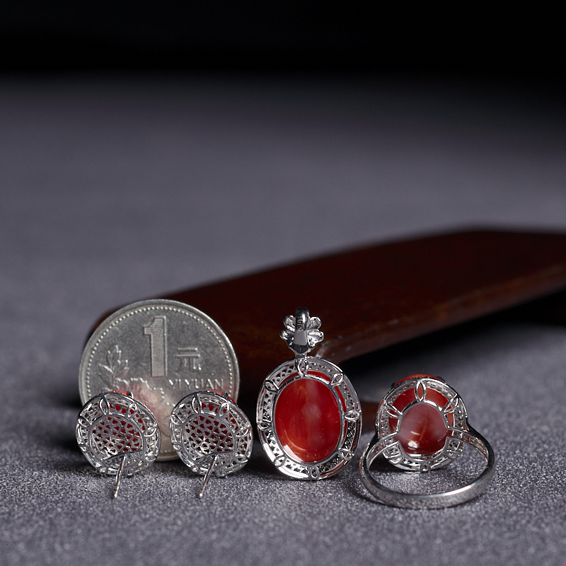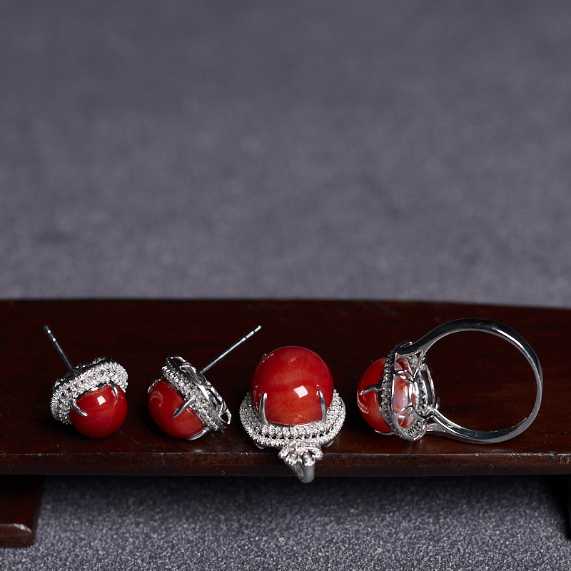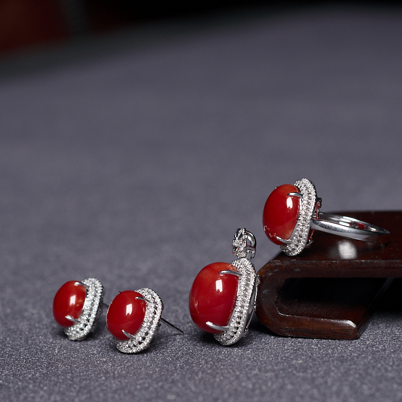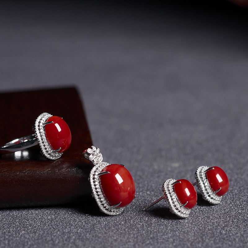 • 18K阿卡牛血红珊瑚戒指/吊坠/耳钉套装