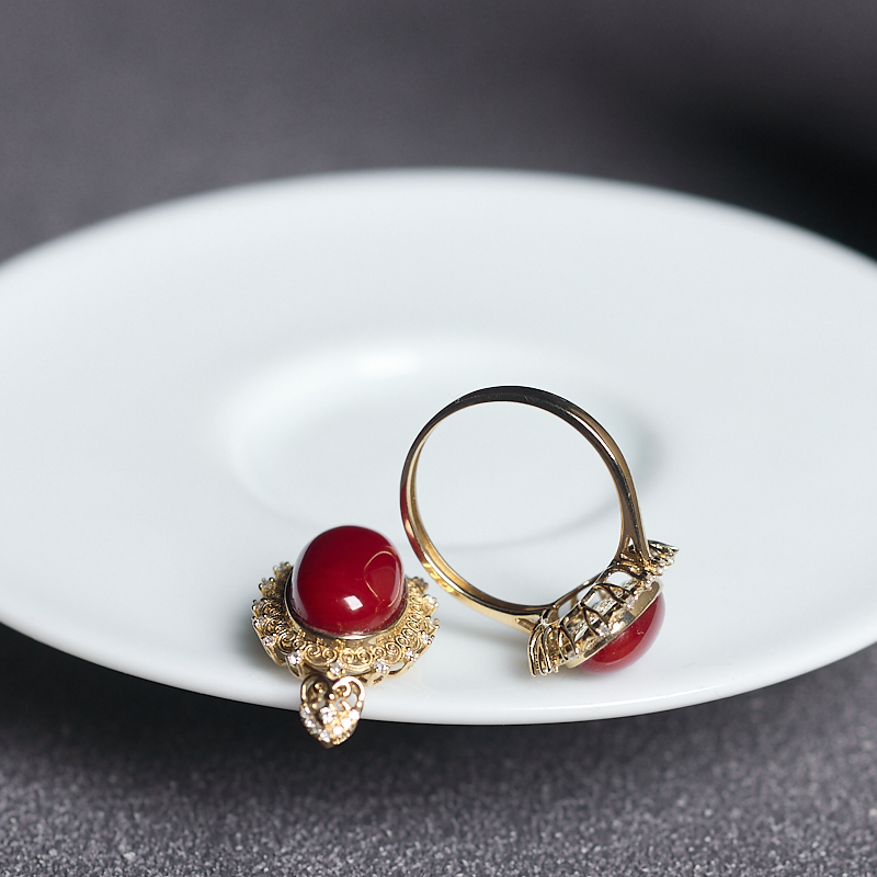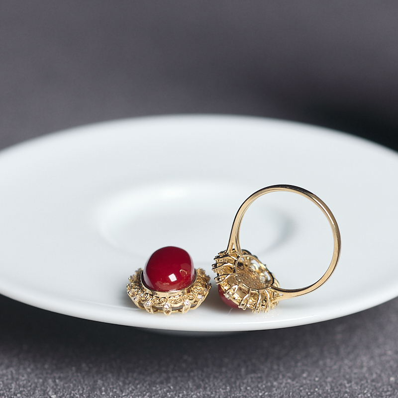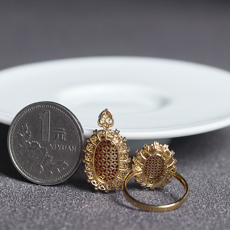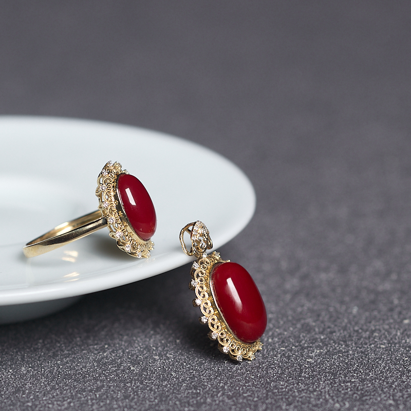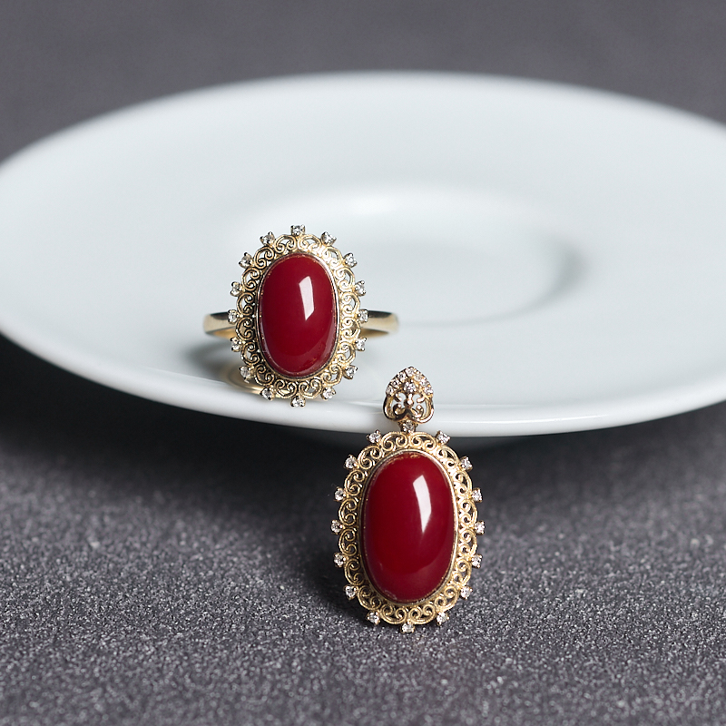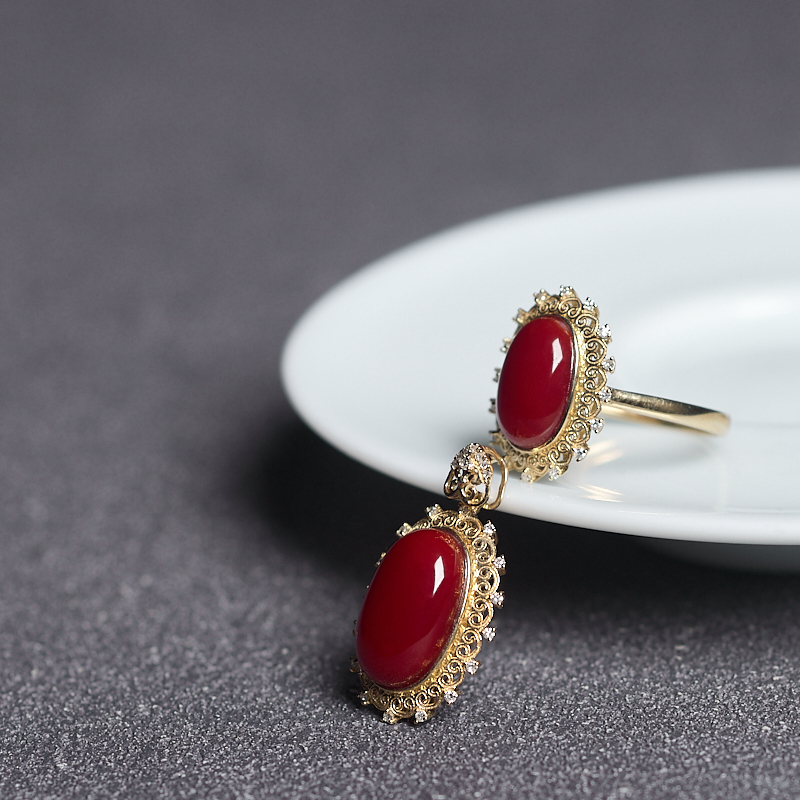 • 18K阿卡牛血红珊瑚戒指/吊坠套装