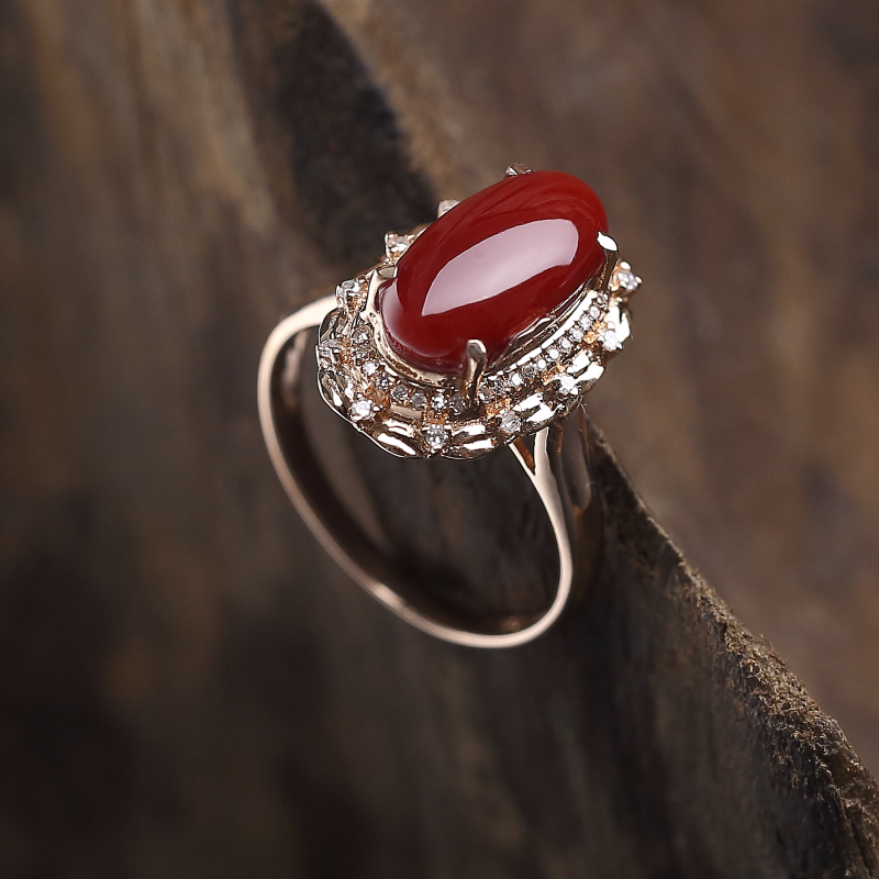 • 18K金镶钻天然阿卡深红珊瑚戒指-红掌柜