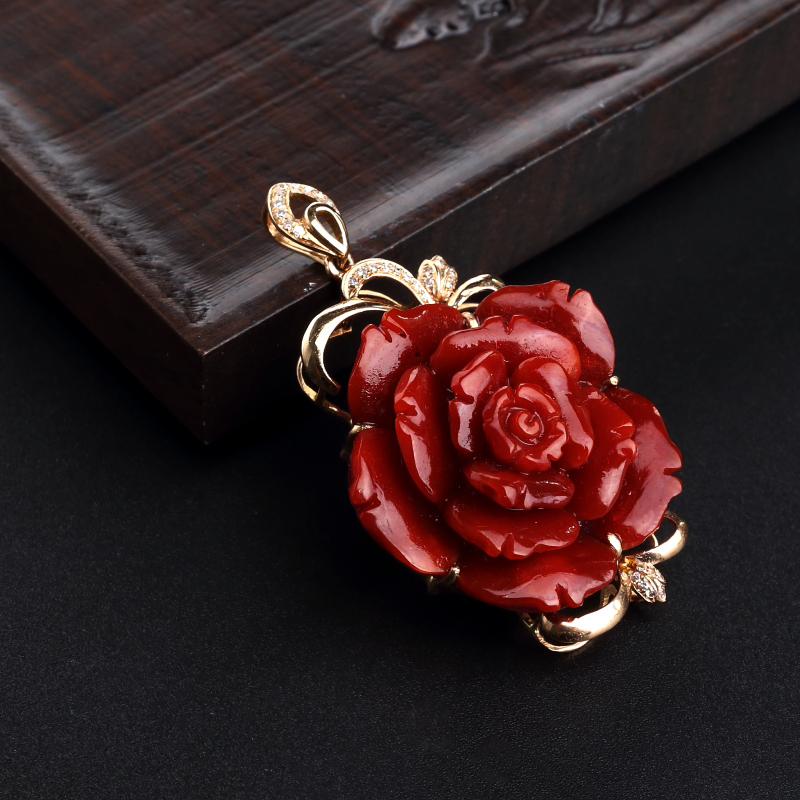 • 18K金镶钻阿卡牛血红珊瑚吊坠