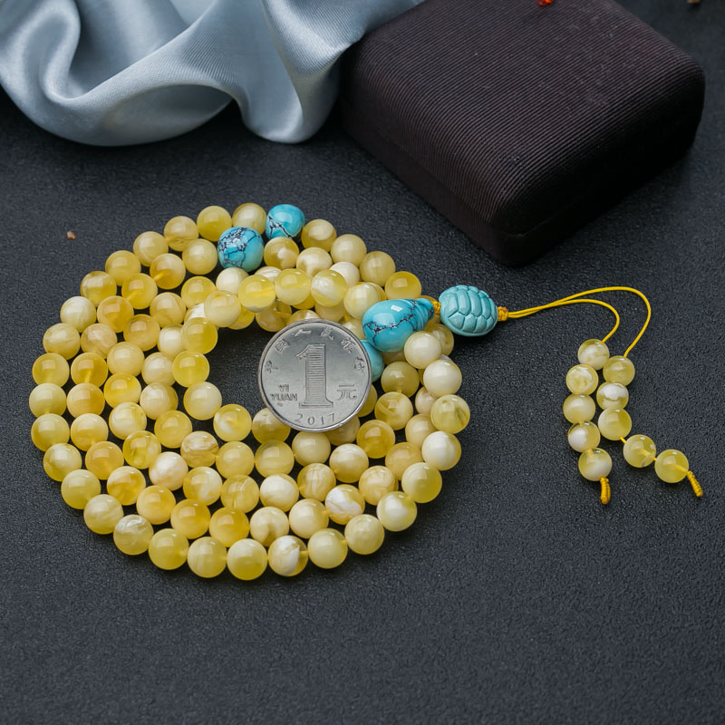 珠径11.1mm厚10.9mm;全长96cm,蜜蜡珠数108颗