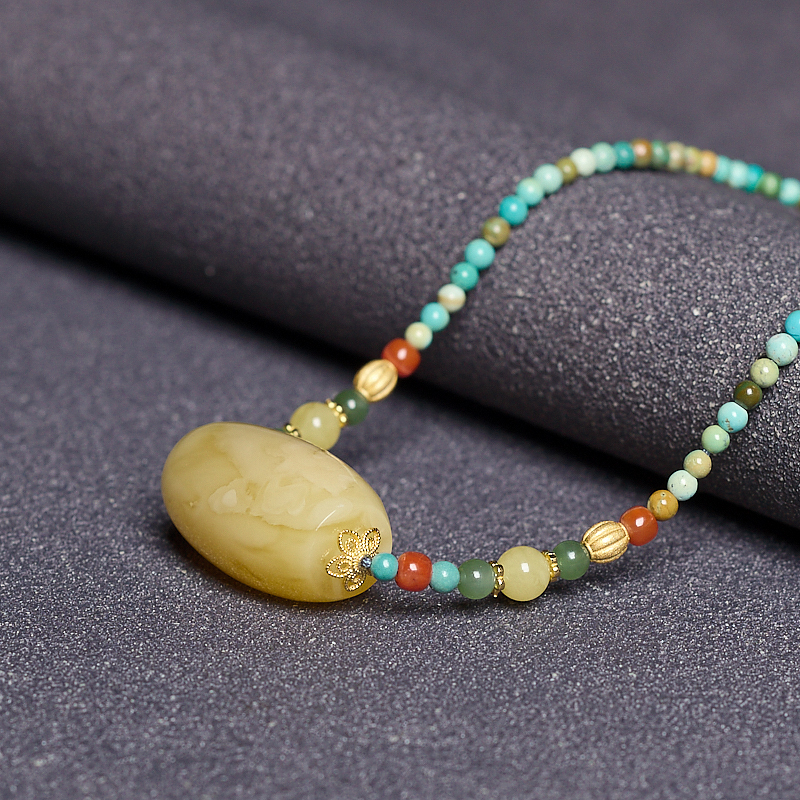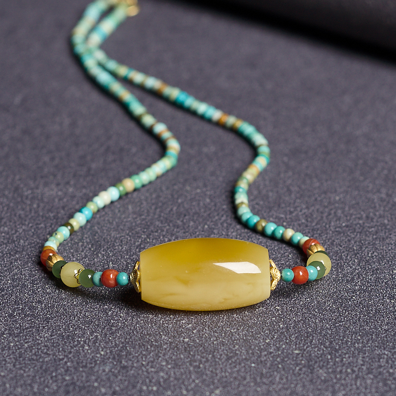 配饰:绿松石、南红、蜜蜡、碧玉、银饰 银扣