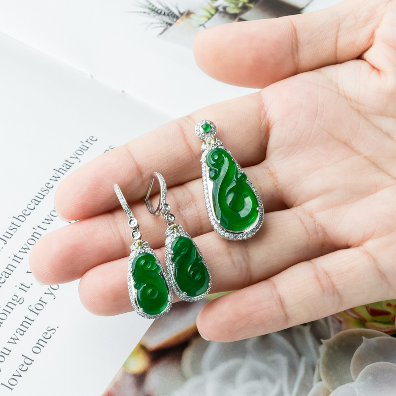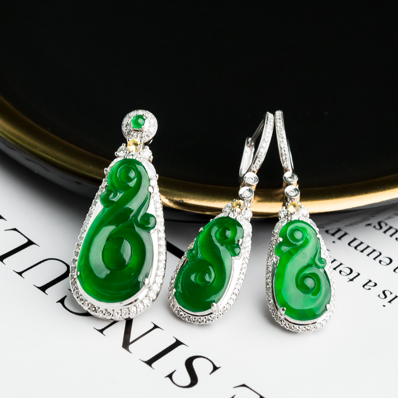 • 18K冰种阳绿翡翠耳坠/吊坠套装