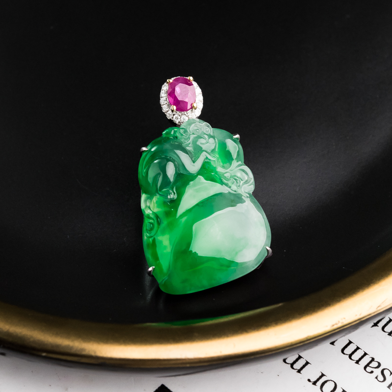 • 18K冰种阳绿翡翠灵猴献寿吊坠