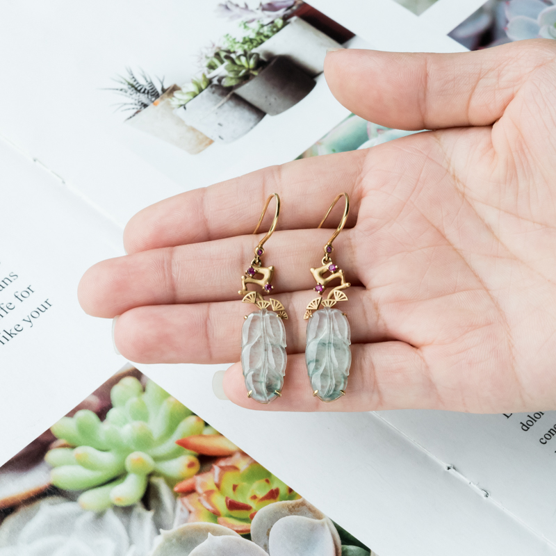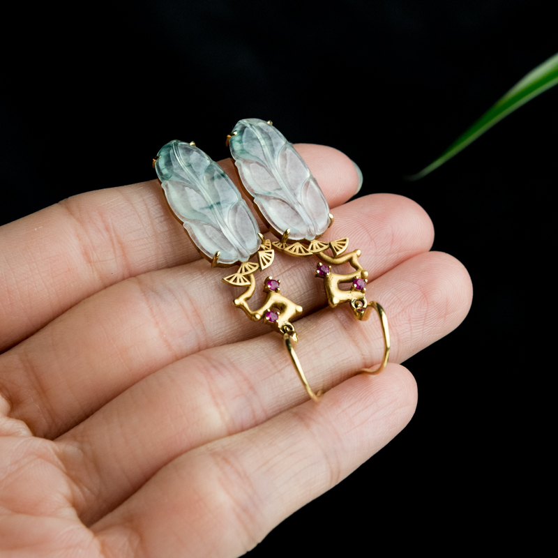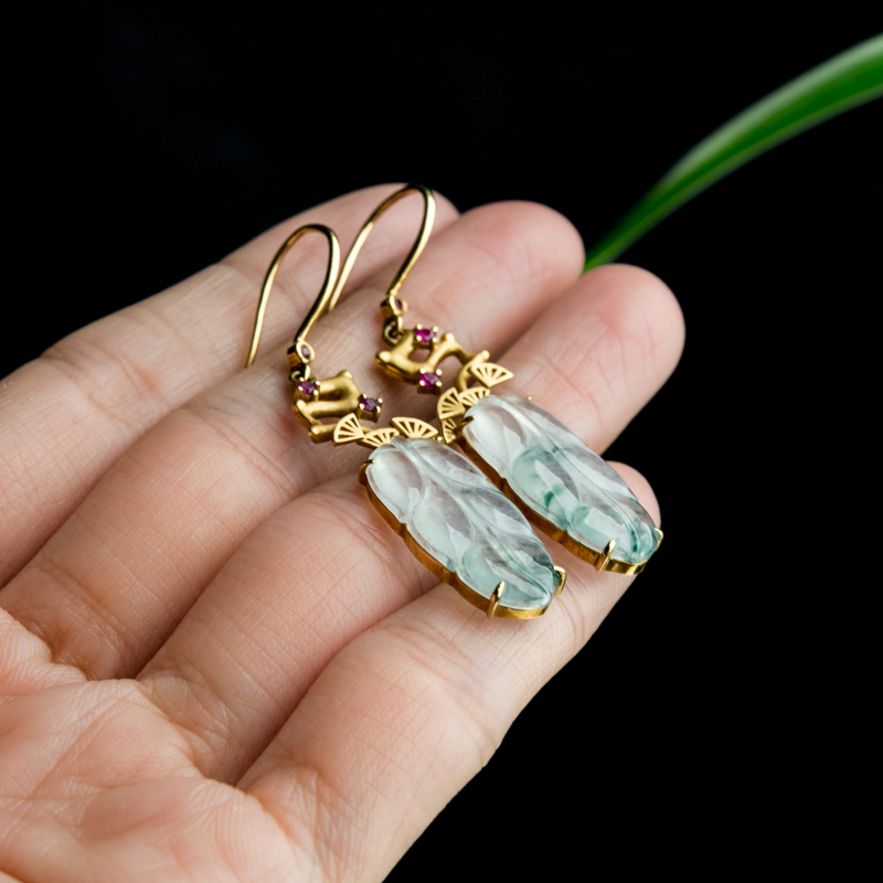 • 18K冰种飘花翡翠金枝玉叶耳坠