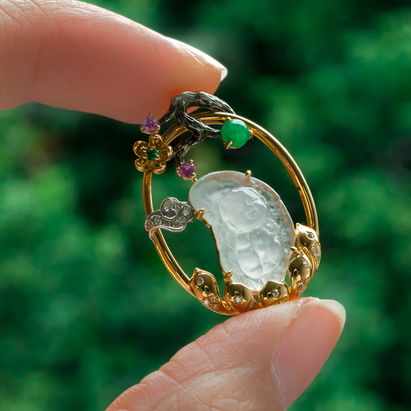 • 18K冰种翡翠童趣吊坠