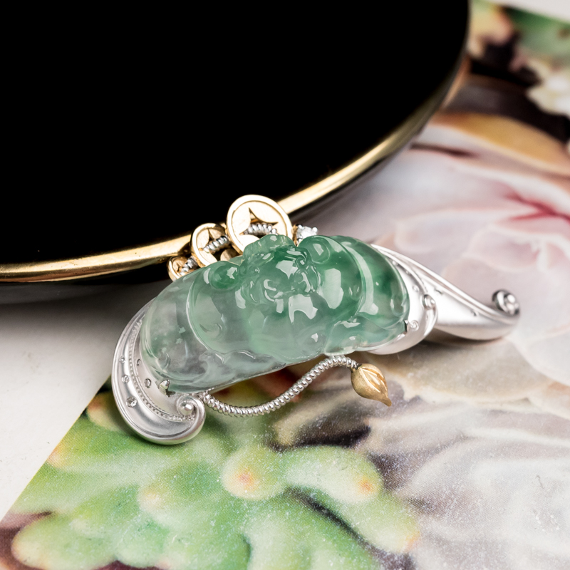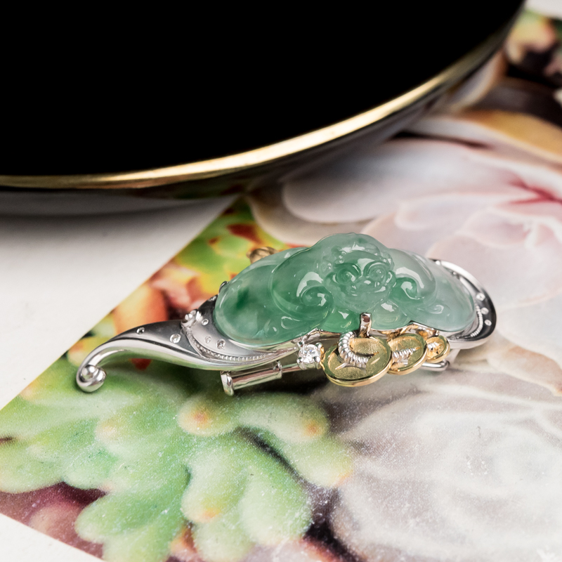 • 18K冰种飘花翡翠福在眼前胸针