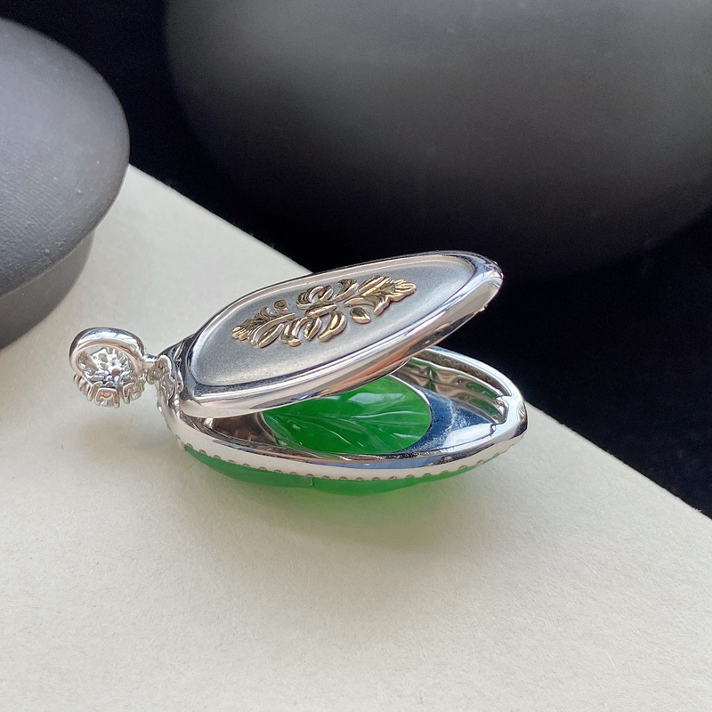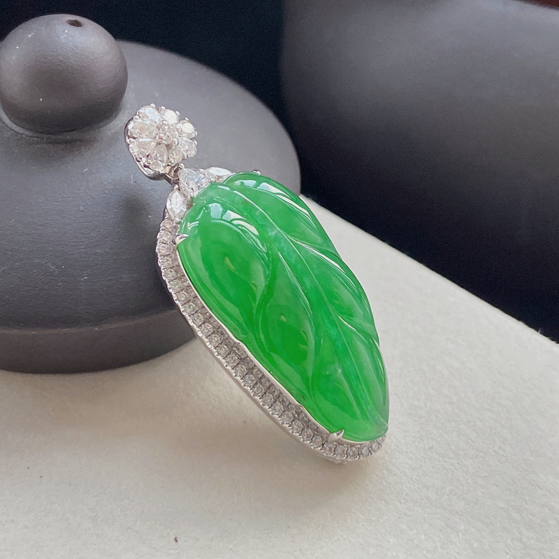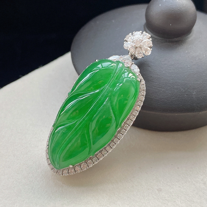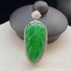 • 18K冰种翠绿翡翠叶子吊坠