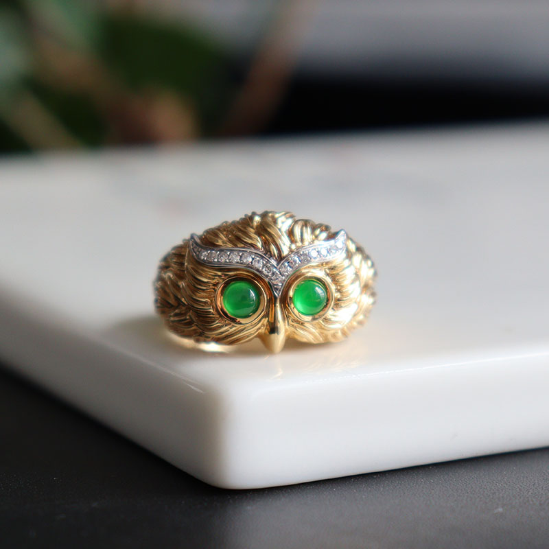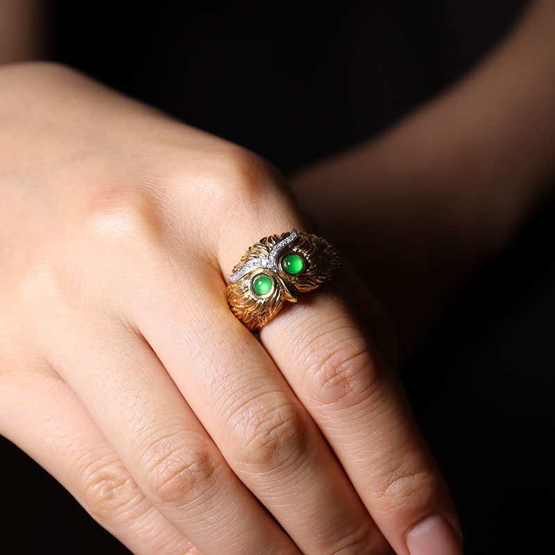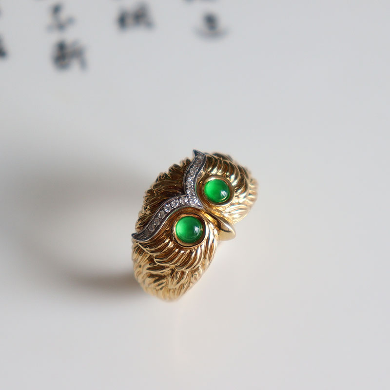 • 18k冰种阳绿翡翠猫头鹰戒指