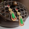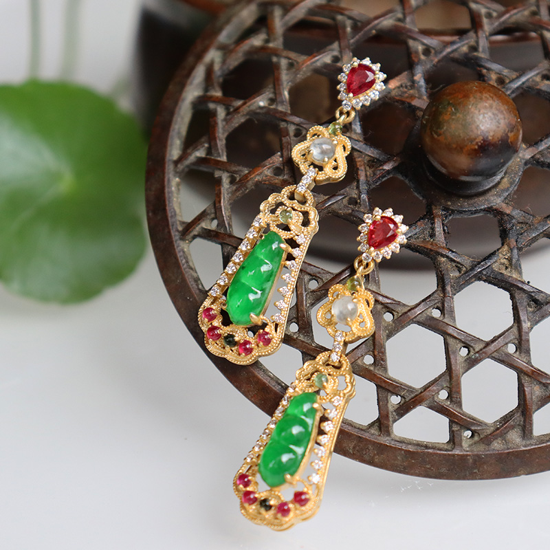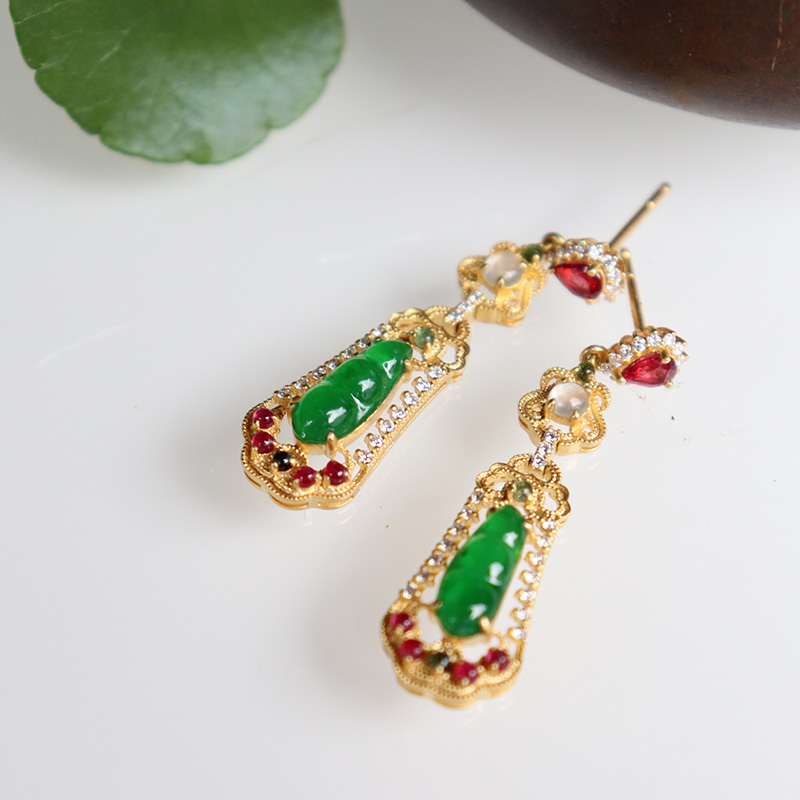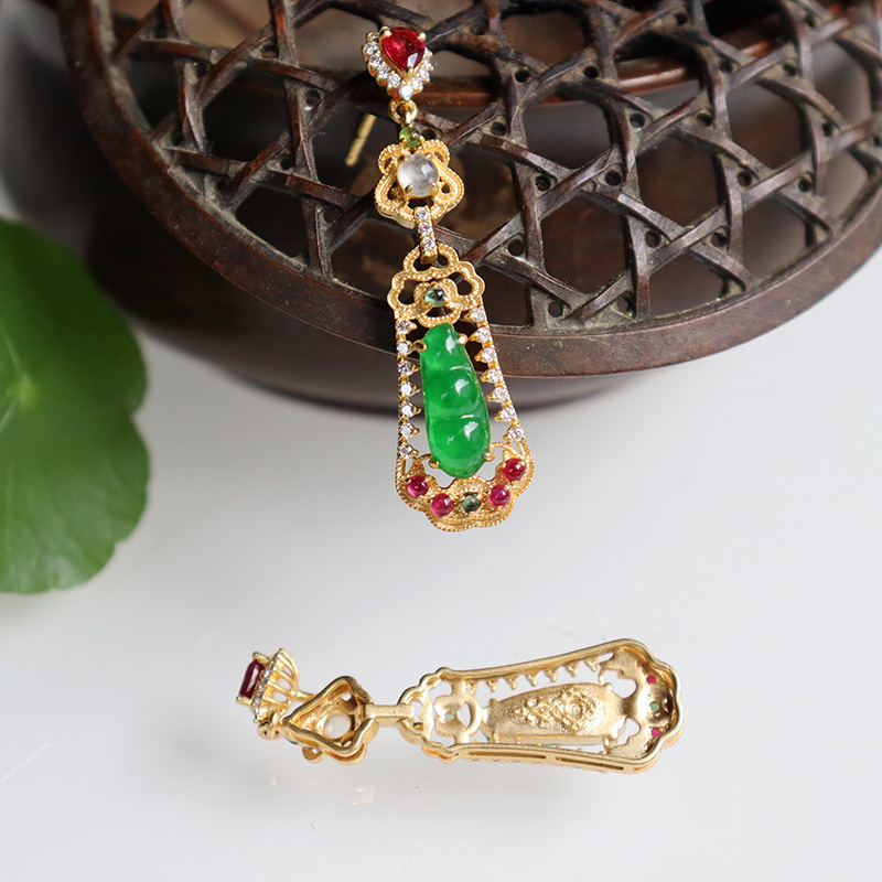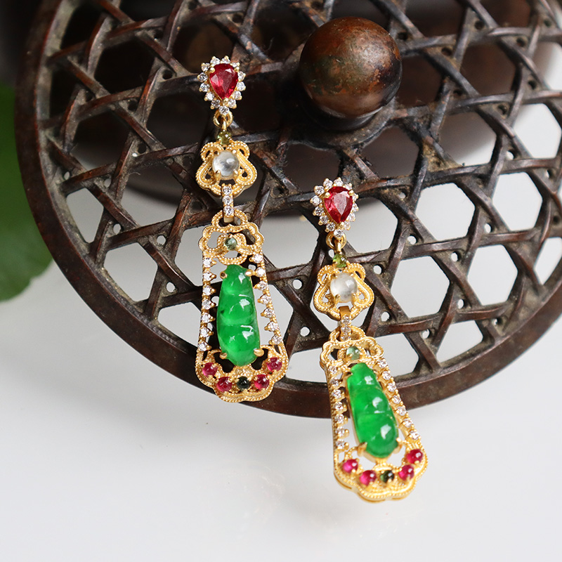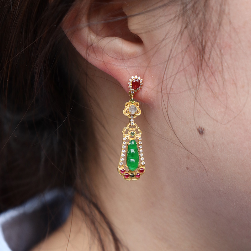 • 18k冰种翠绿翡翠连中三元耳钉