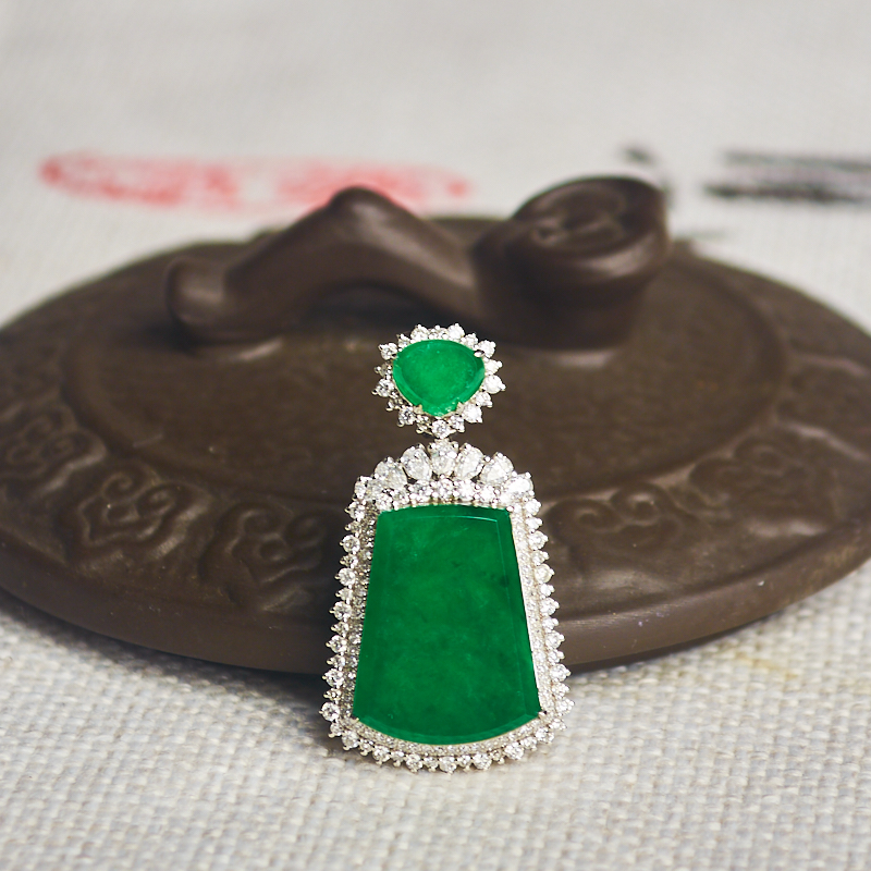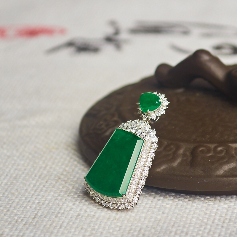 • 18K冰种翠绿翡翠无事牌吊坠