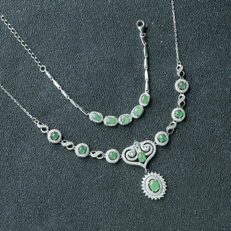 • [名  称] 银镶糯冰种苹果绿翡翠四件套