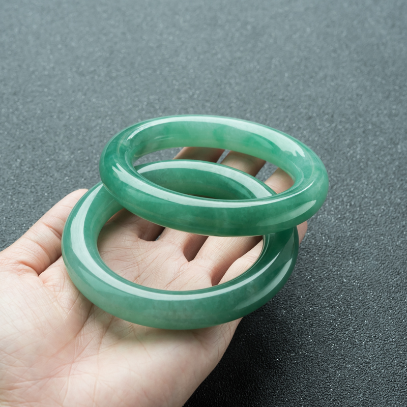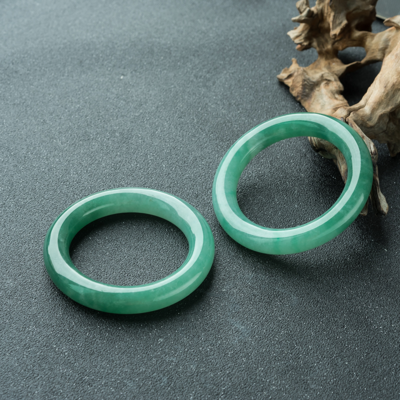 • 57mm糯冰种翠绿翡翠圆镯(一对)