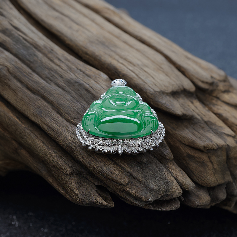 • 18K糯冰种阳绿翡翠弥勒佛吊坠