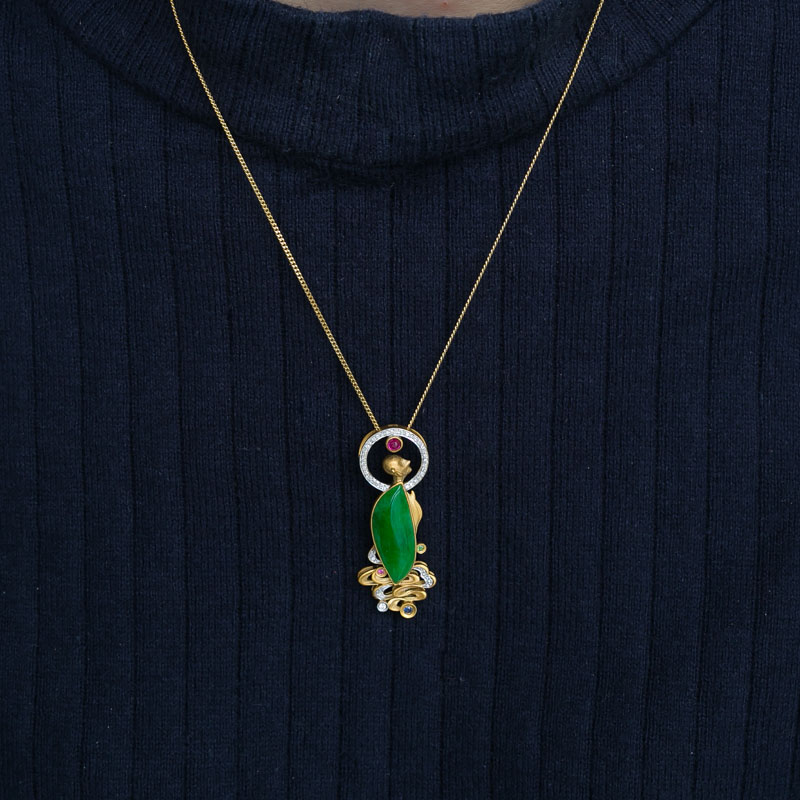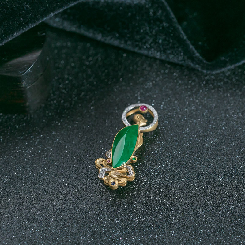 • 18K糯冰种翠绿翡翠悟道吊坠