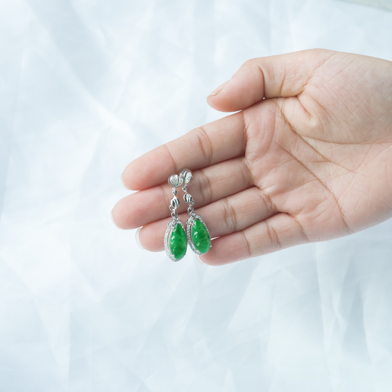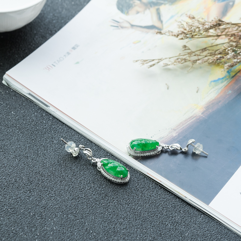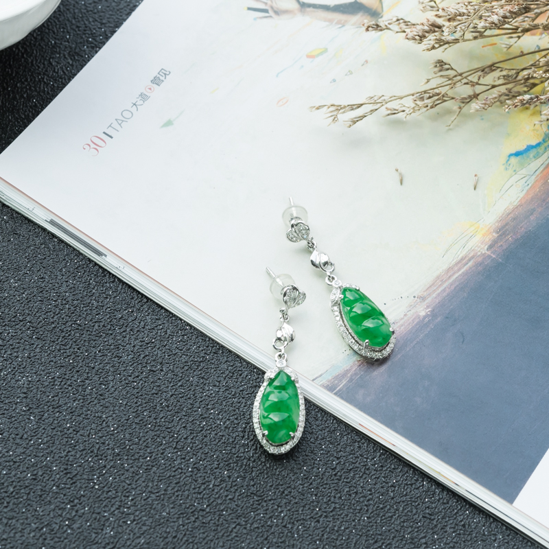 • 18K糯冰种翠绿翡翠福豆耳坠