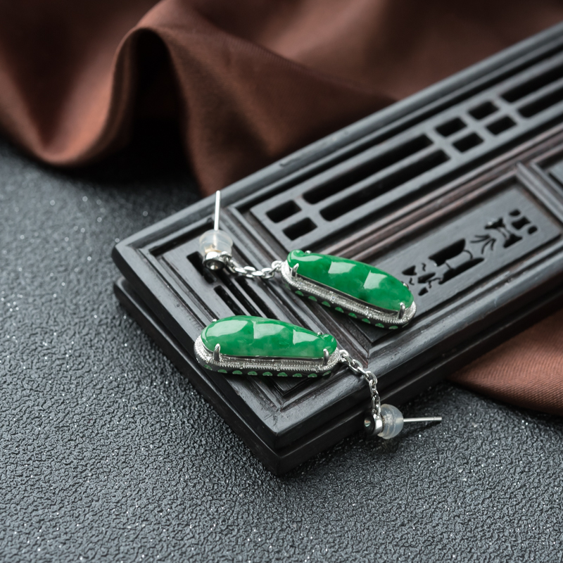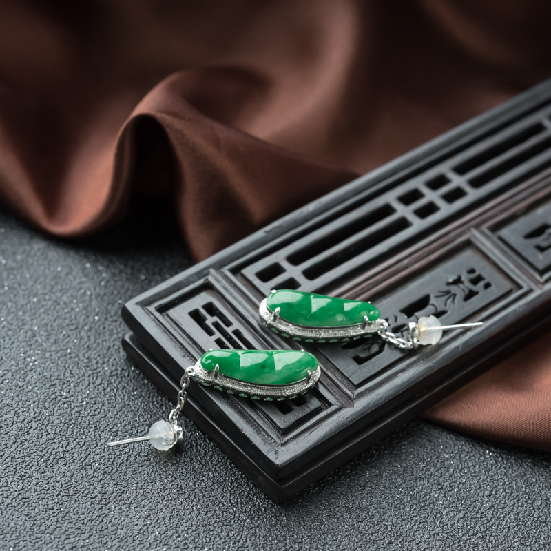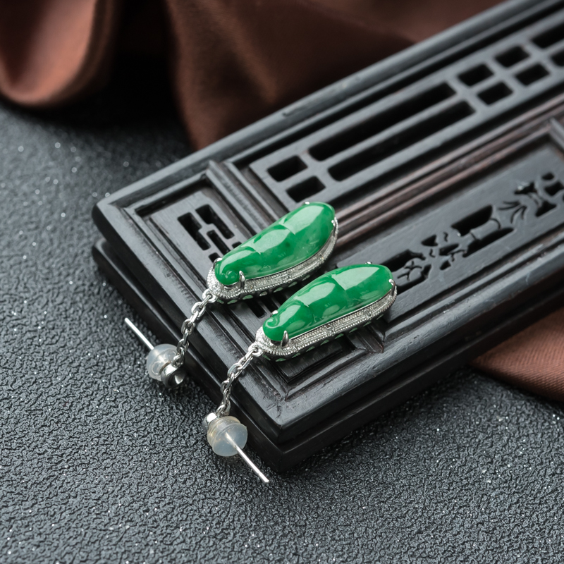 • 18K糯冰种翠绿翡翠福豆耳坠