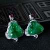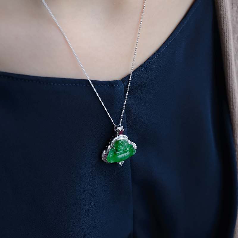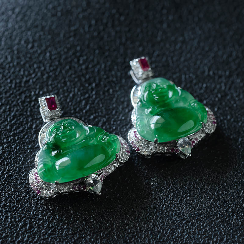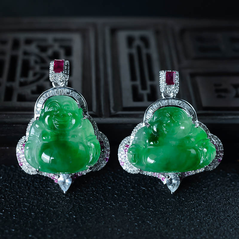 • 18K糯冰种翠绿翡翠弥勒佛吊坠(单件)