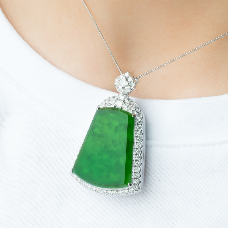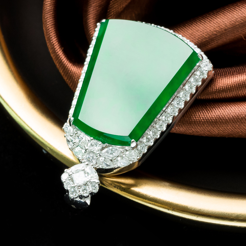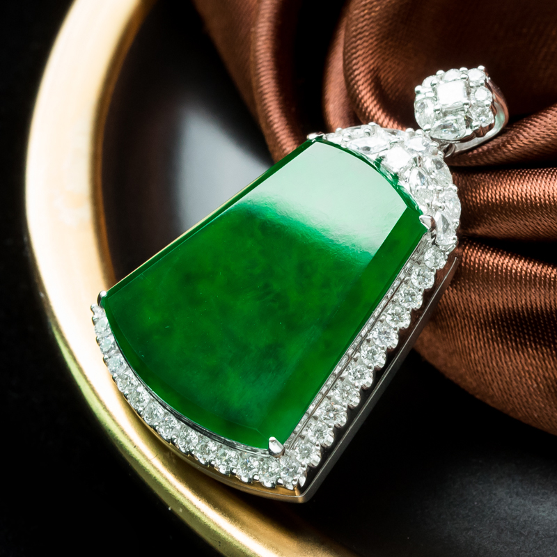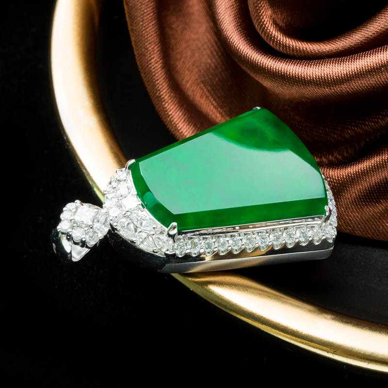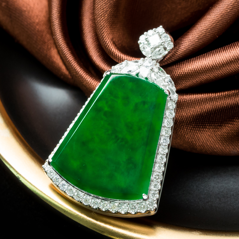 • 18K糯冰种翠绿翡翠无事牌吊坠