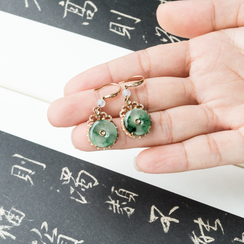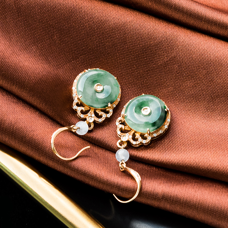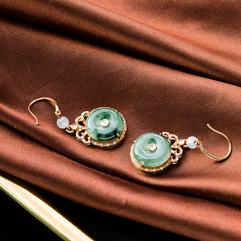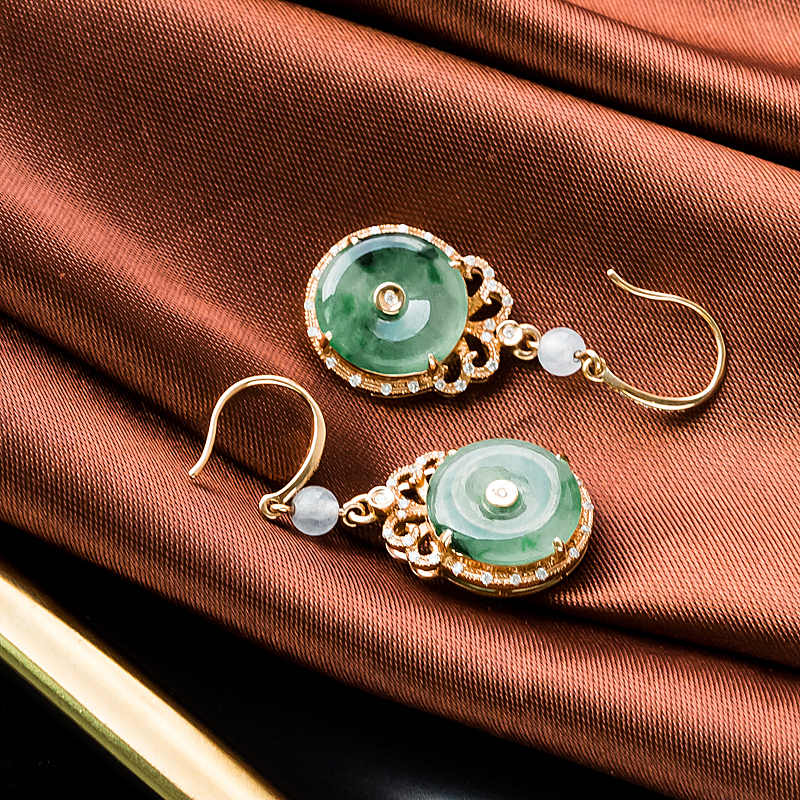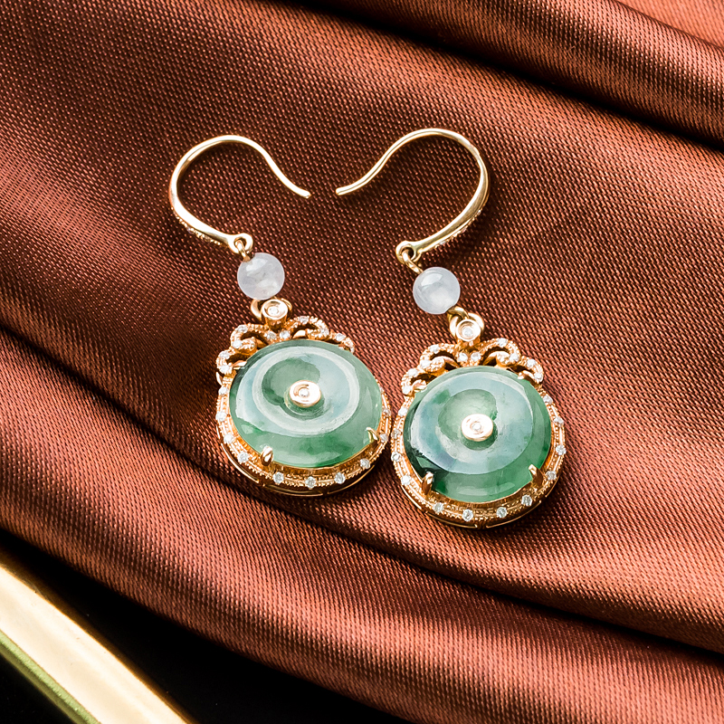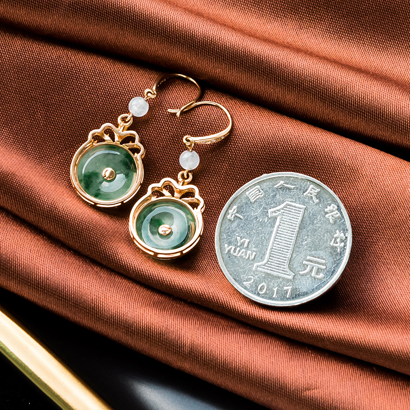• 18K糯冰种飘翠翡翠平安扣耳坠