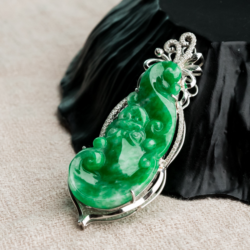 • 18K糯冰种翠绿翡翠瑞兽吊坠